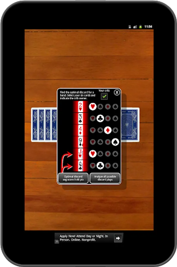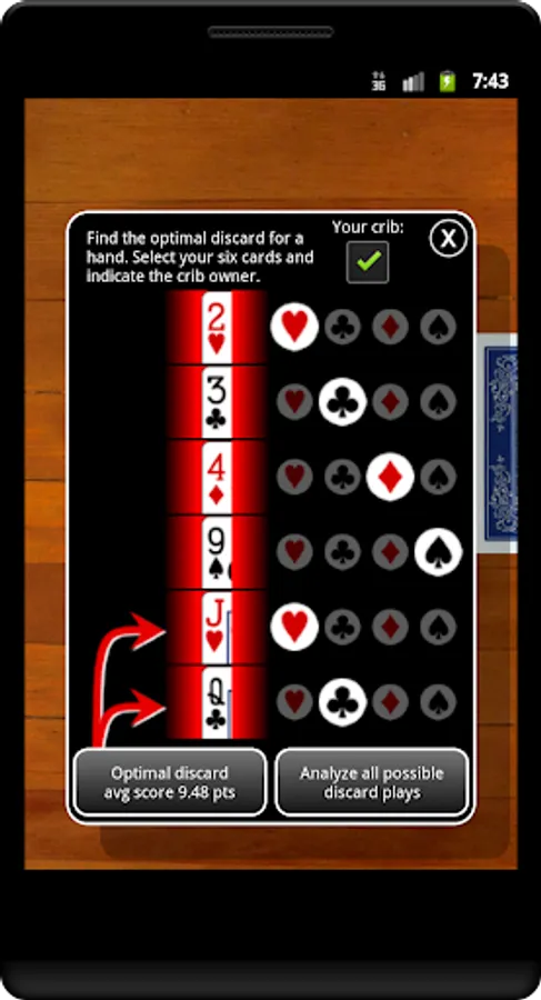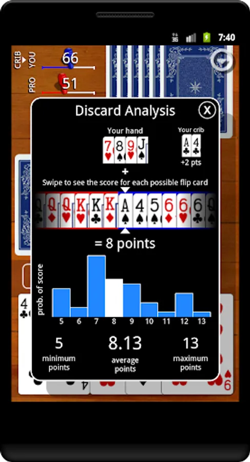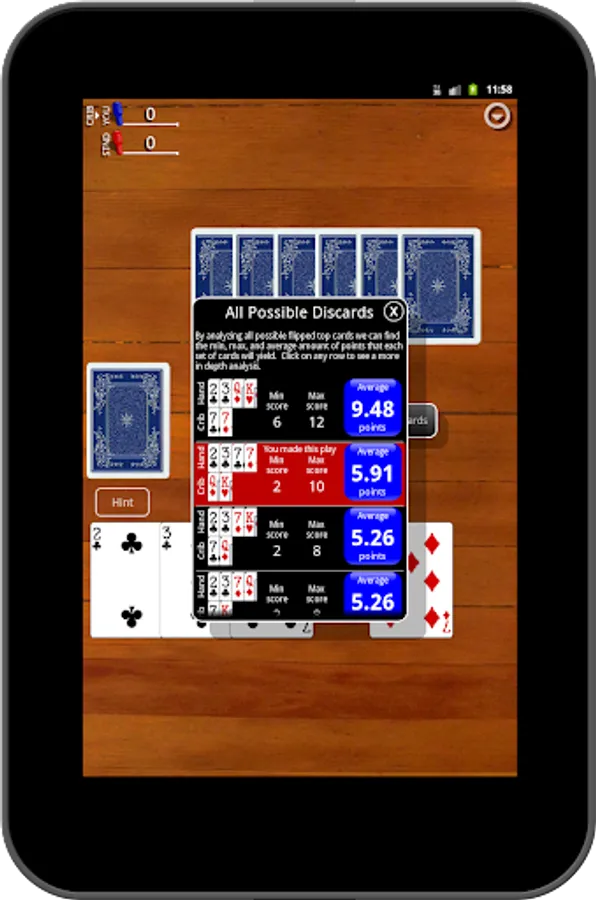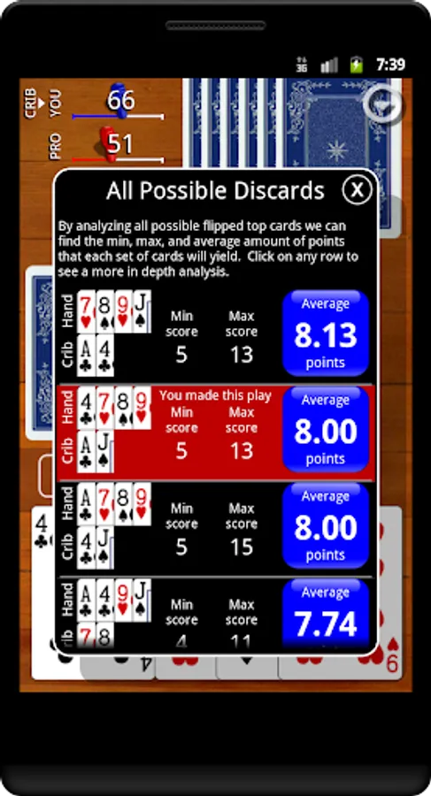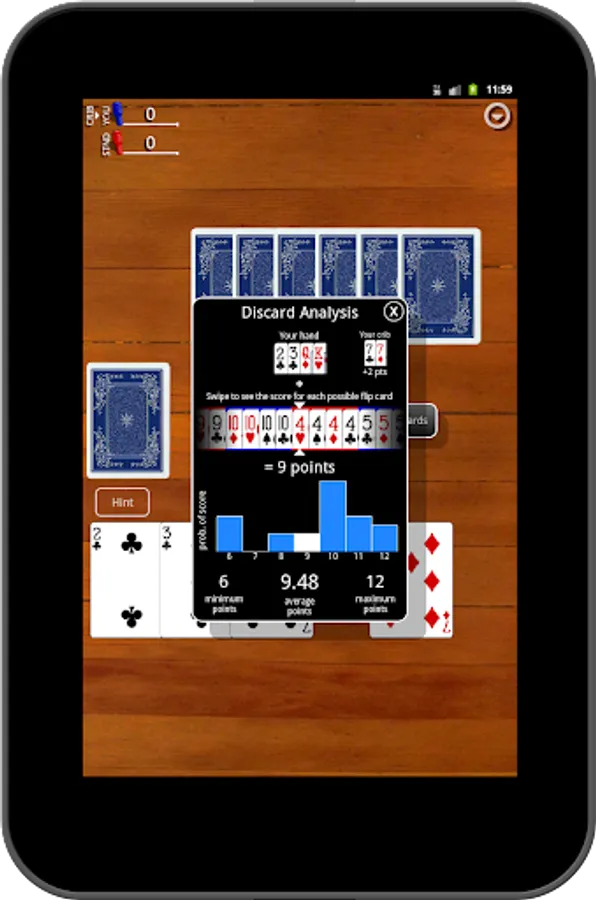 Cribbage Classic also has a "Discard Analyzer" bonus feature that can help you decide on the optimal discard to play given a particular cribbage hand. Analyzer shows you the minimum, maximum, and average score for each permutation along with an in-depth statistical analysis of all possible flip card results.
