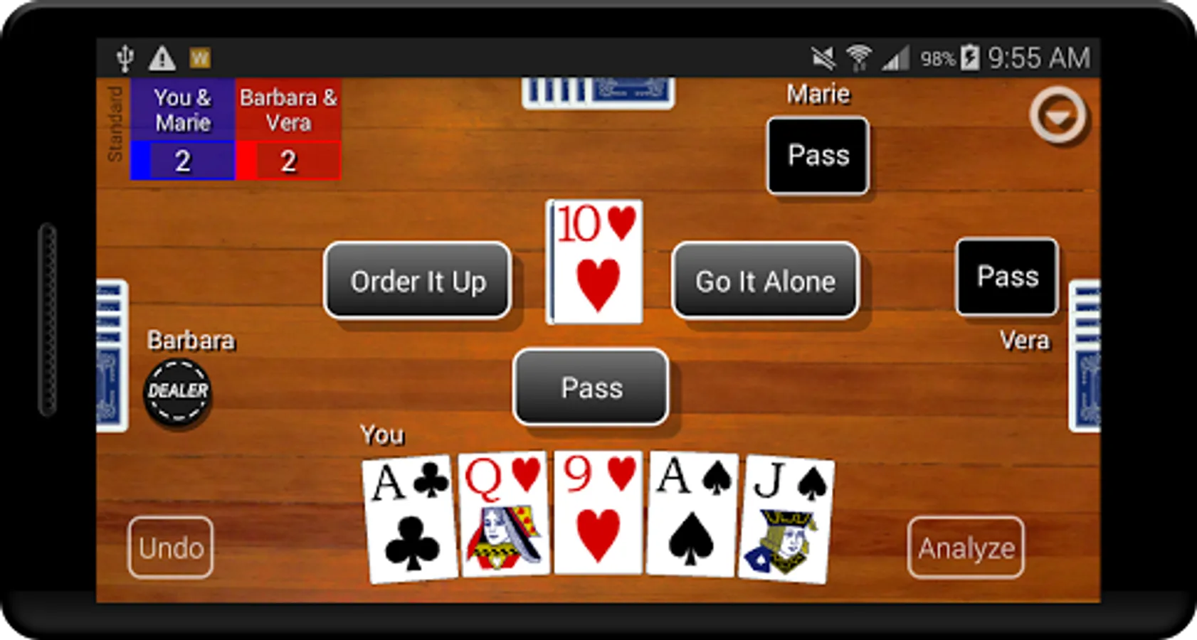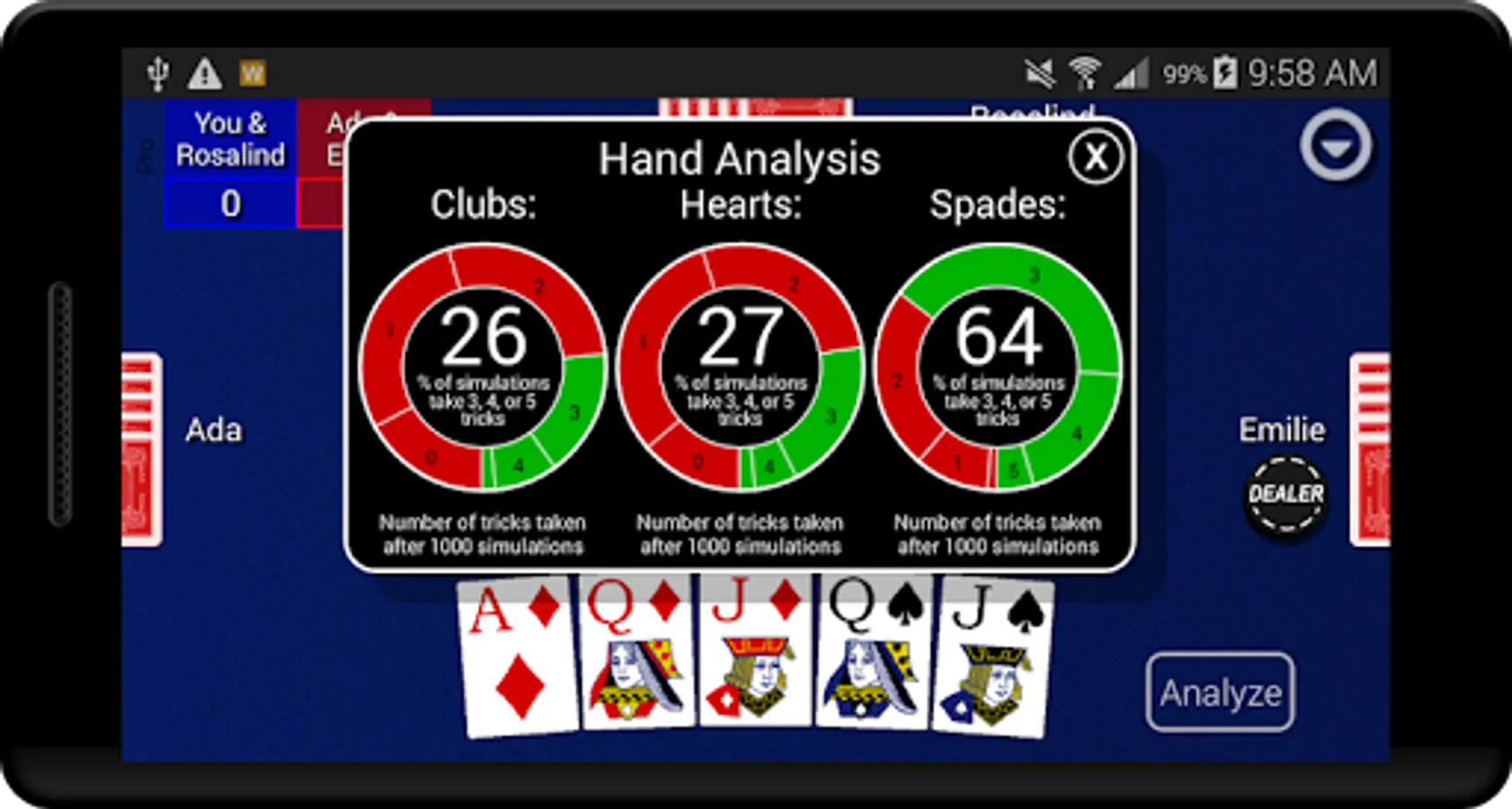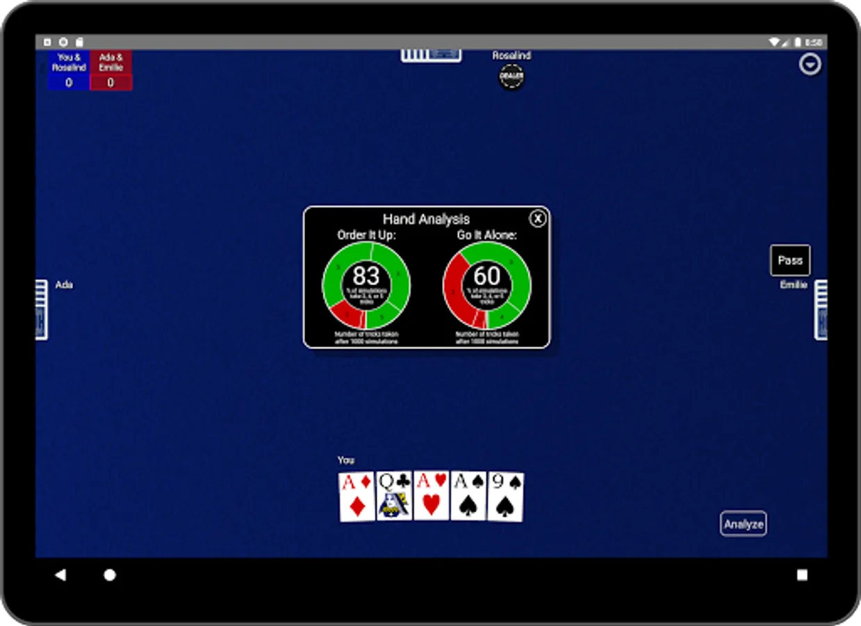 Euchre Card Classic also has a "Hand Analysis" feature that will show you the probability that you will score if you order up or select a trump suit or go it alone.