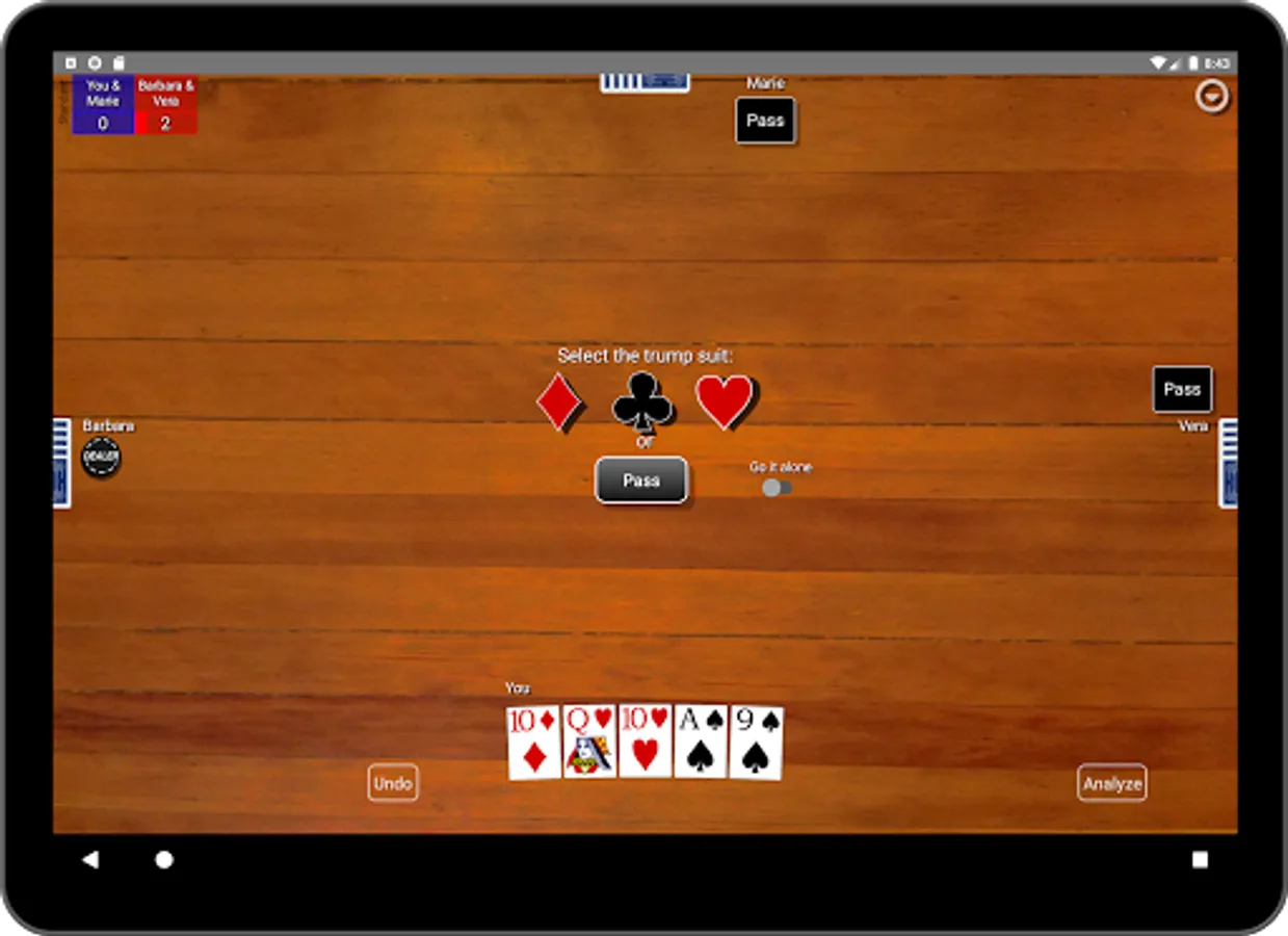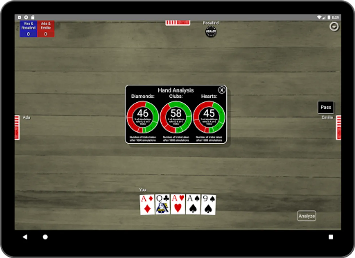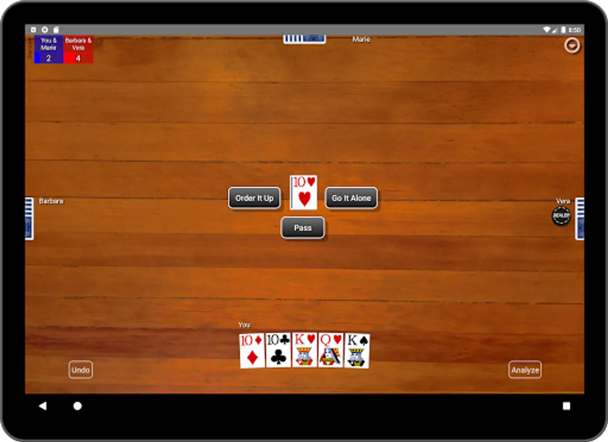 Euchre Card Classic also has a "Hand Analysis" feature that will show you the probability that you will score if you order up or select a trump suit or go it alone.