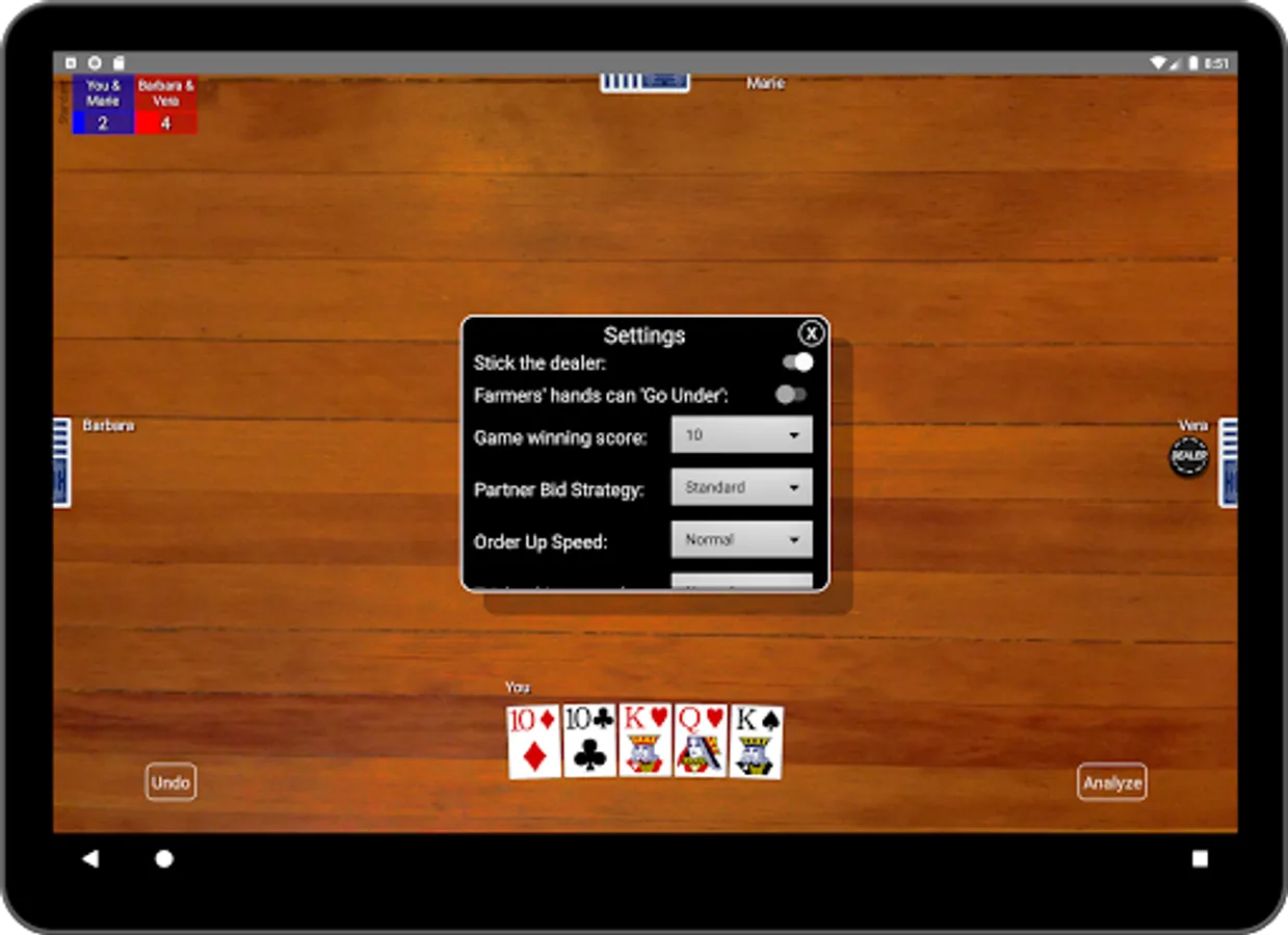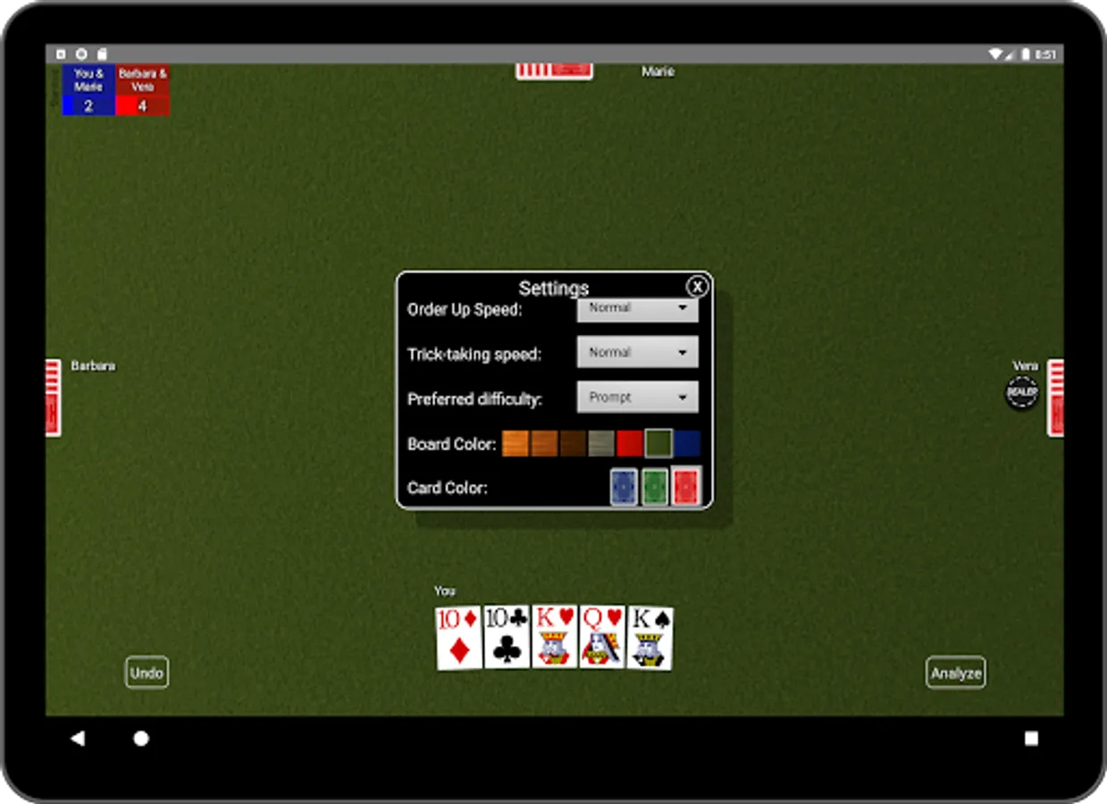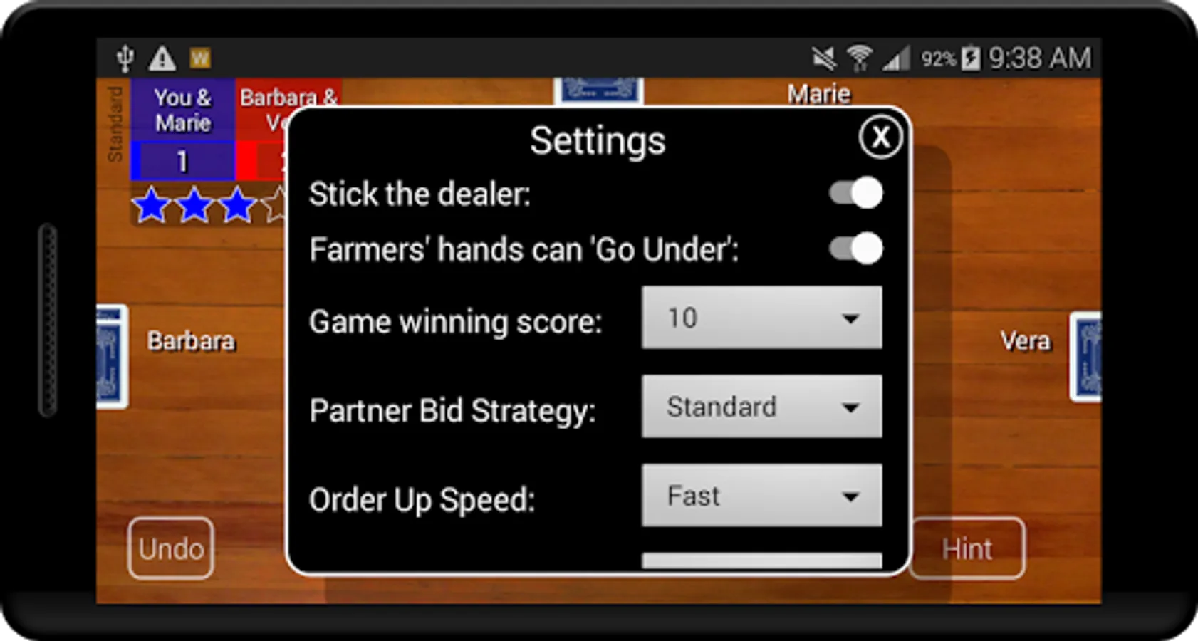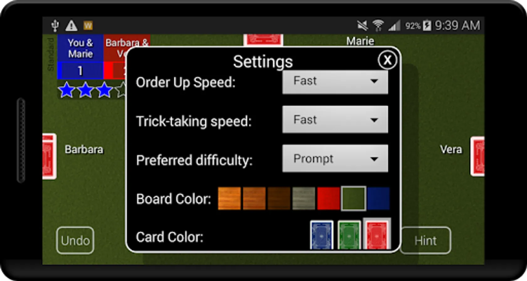 Euchre Card Classic has three different difficulty settings so you can work your way up to playing like a pro. Statistics are kept for wins and losses and frequency of making your bid when you order up, choose trump, or go it alone, so you can see yourself improving over time. All cards are dealt randomly to all players, so the difference between the Easy, Standard, and Pro computer players is in how they choose to play the cards they are dealt. A hint button can be turned on to help you see how the computer Pro player would handle your current situation.