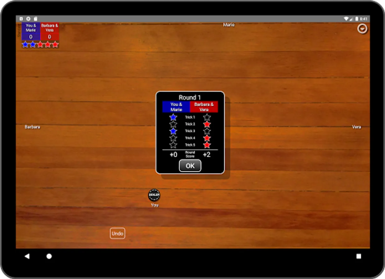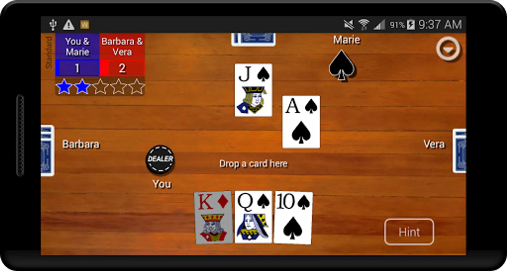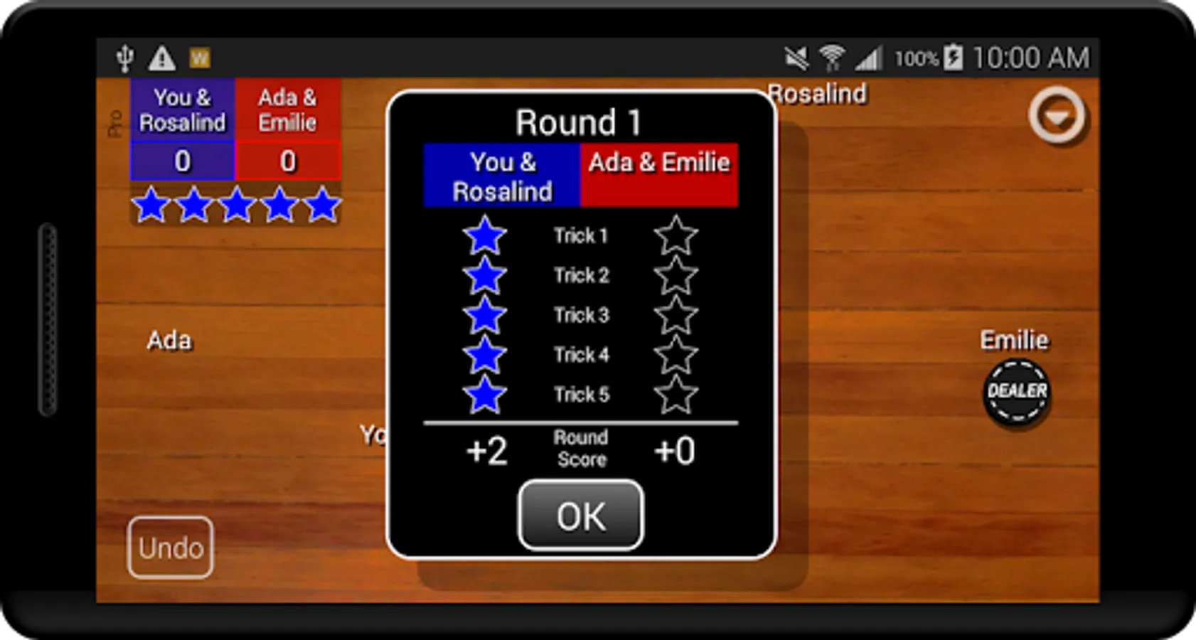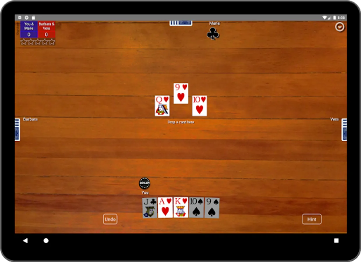 Euchre Card Classic has three different difficulty settings so you can work your way up to playing like a pro. Statistics are kept for wins and losses and frequency of making your bid when you order up, choose trump, or go it alone, so you can see yourself improving over time. All cards are dealt randomly to all players, so the difference between the Easy, Standard, and Pro computer players is in how they choose to play the cards they are dealt. A hint button can be turned on to help you see how the computer Pro player would handle your current situation.