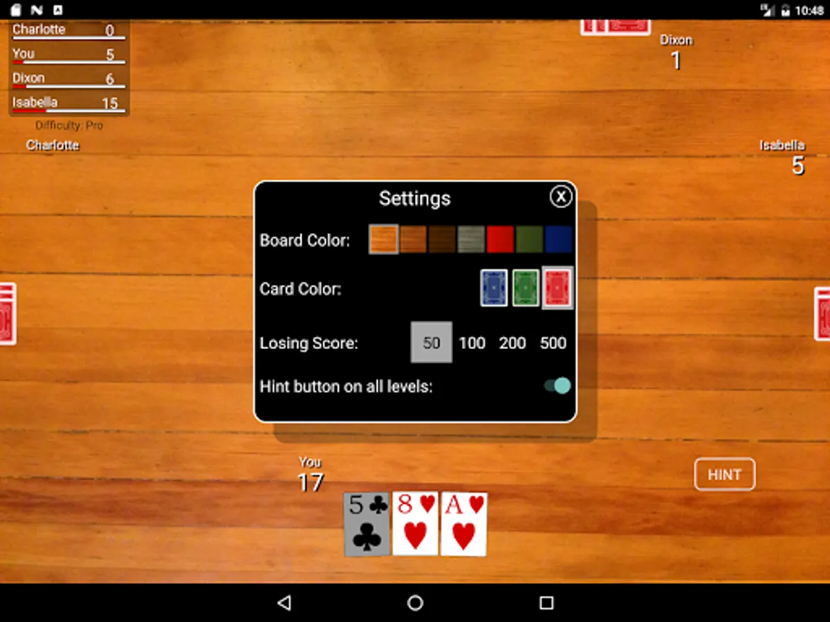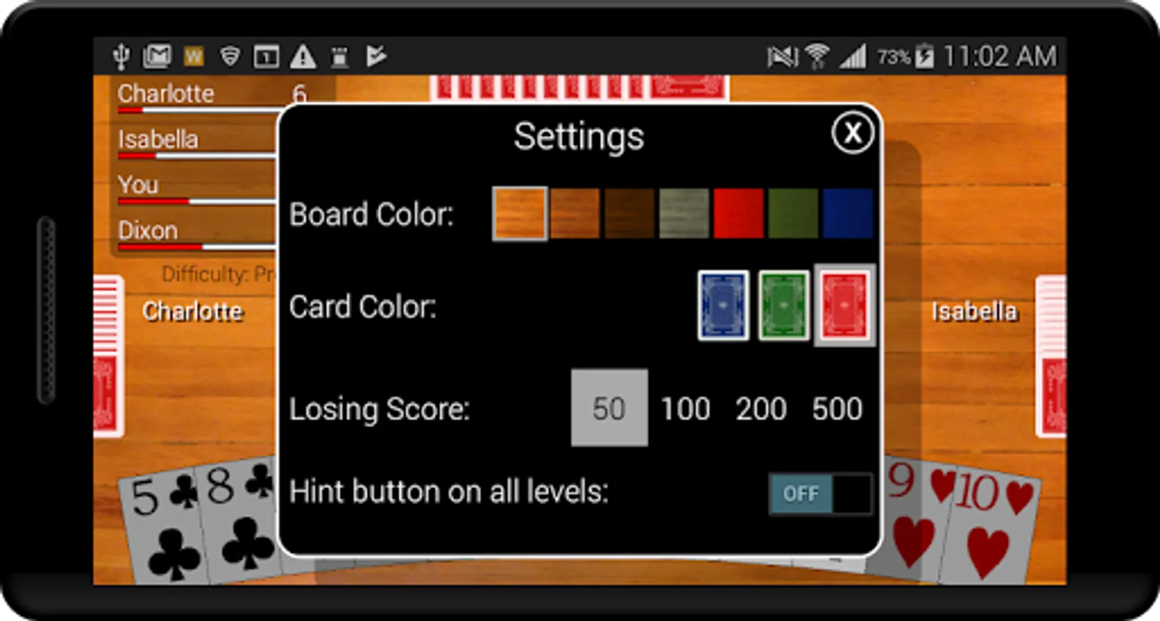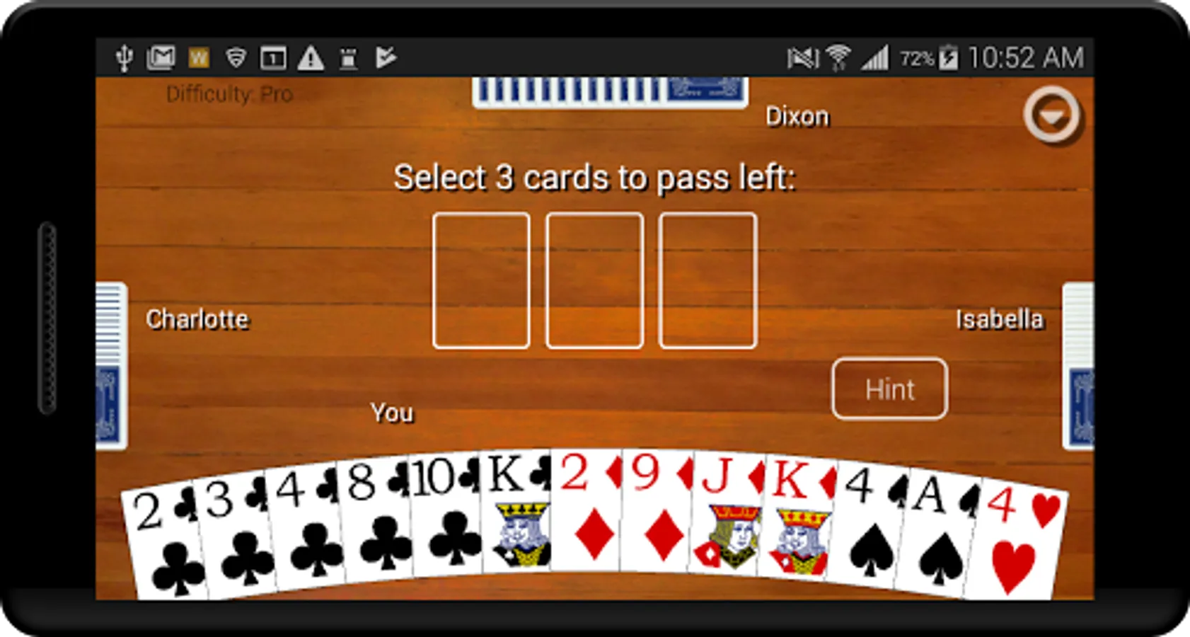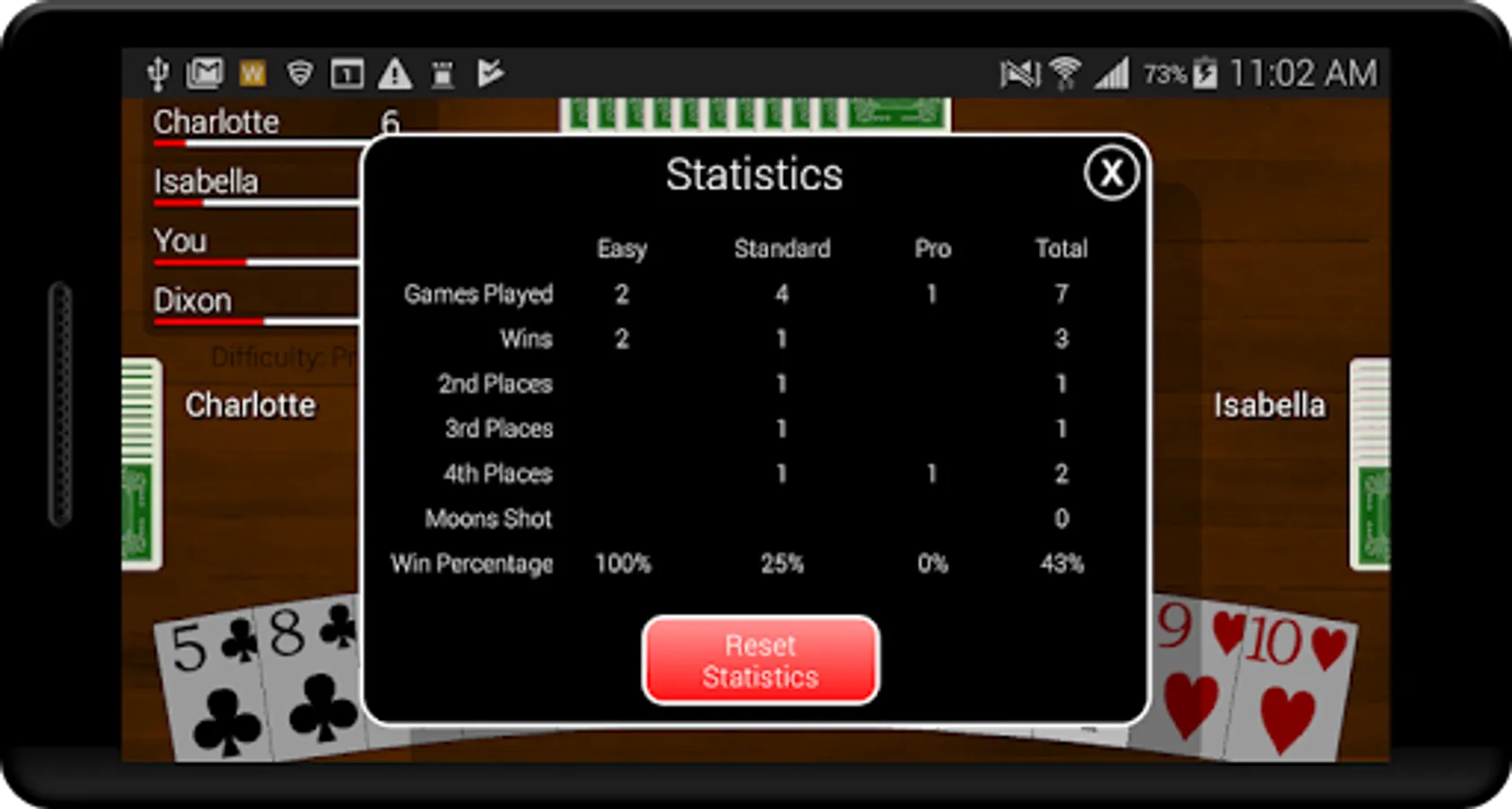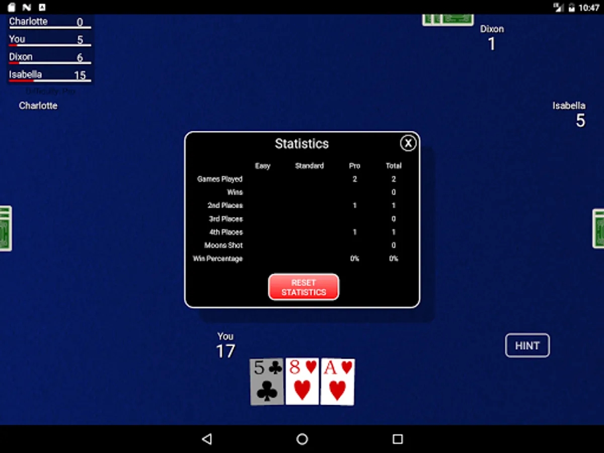 Improve your skills and become a Hearts pro! Hearts Card Classic has three different difficulty settings so you can work your way up to playing like a pro. Statistics are kept for wins and losses and moon shots so you can see yourself improving over time. All cards are dealt randomly to all players, so the difference between the Easy, Standard, and Pro computer players is in how they choose to play the cards they are dealt. A hint button can be turned on to help you see how the computer Pro player would handle your current situation.