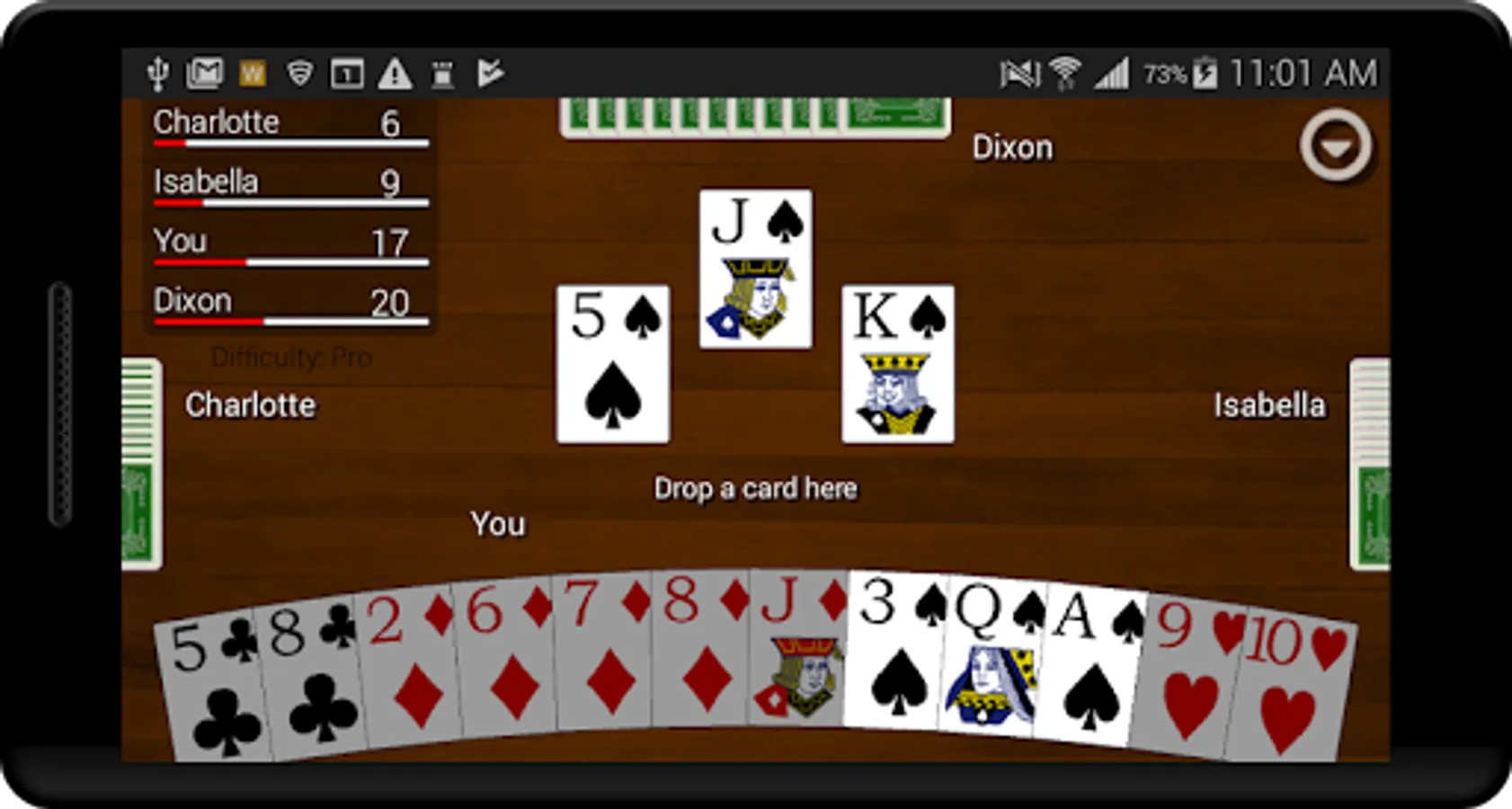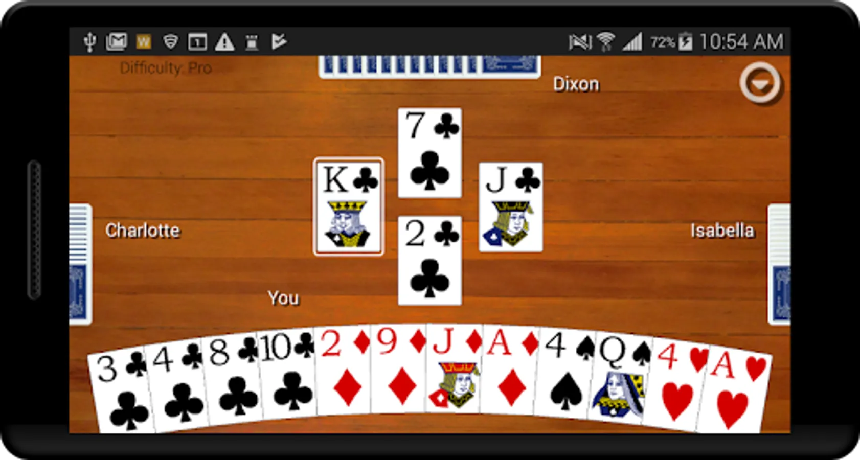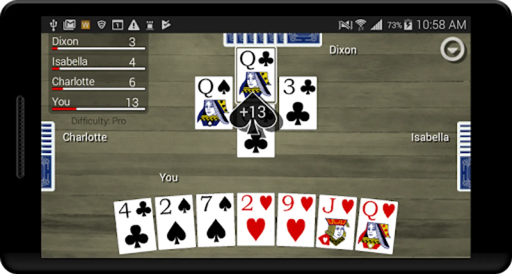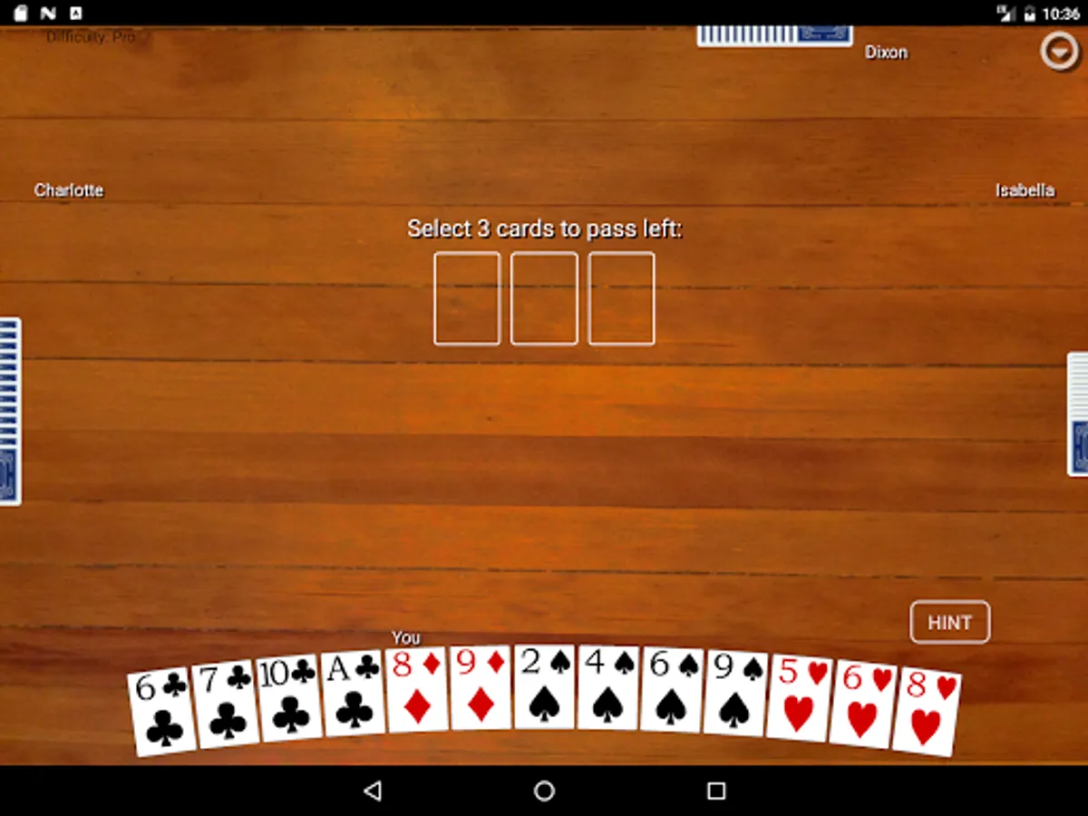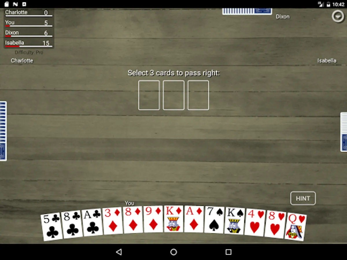 Improve your skills and become a Hearts pro! Hearts Card Classic has three different difficulty settings so you can work your way up to playing like a pro. Statistics are kept for wins and losses and moon shots so you can see yourself improving over time. All cards are dealt randomly to all players, so the difference between the Easy, Standard, and Pro computer players is in how they choose to play the cards they are dealt. A hint button can be turned on to help you see how the computer Pro player would handle your current situation.