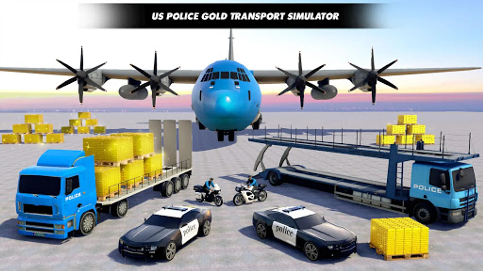 Enjoy Gold truck transport games 2020 & drive across America to transport gold pallets on long trailer truck in custody of police cars and police bike transporter. Become a professional truck driver of city cargo truck driving games and enjoy the career of gold transport truck driver truck driving games. Driving a big city cargo truck is difficult for grand truck driving simulator city cargo plane simulator. Us police airplane transporter gold truck driving may not be easy as it looks! You must be an expert in police truck parking to deliver gold to the Us police gold factory. You can drive gold loader truck simulation from city gold factory to market by unloading gold packs with cargo lifter driving.