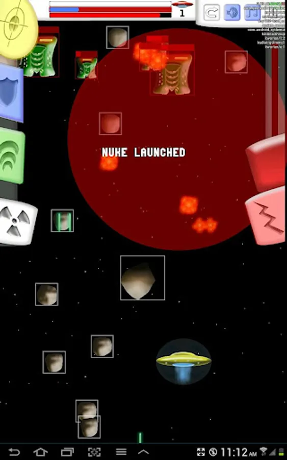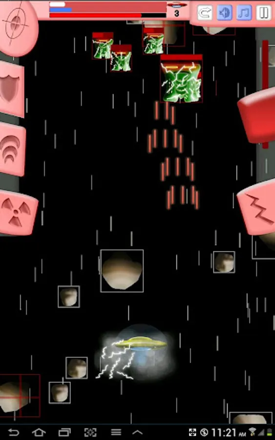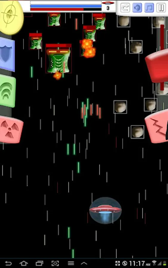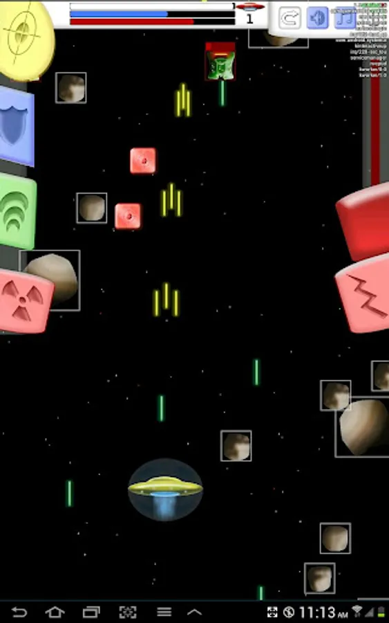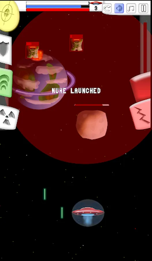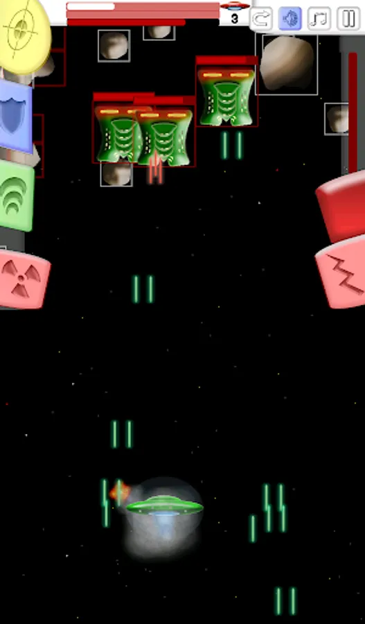 Keep an eye on your UFO hull damage, shield regeneration and weapon power as you fight off hostile aliens and rogue asteroids. Some asteroids have powerups hidden in them, don't hesitate to blast em to bits.