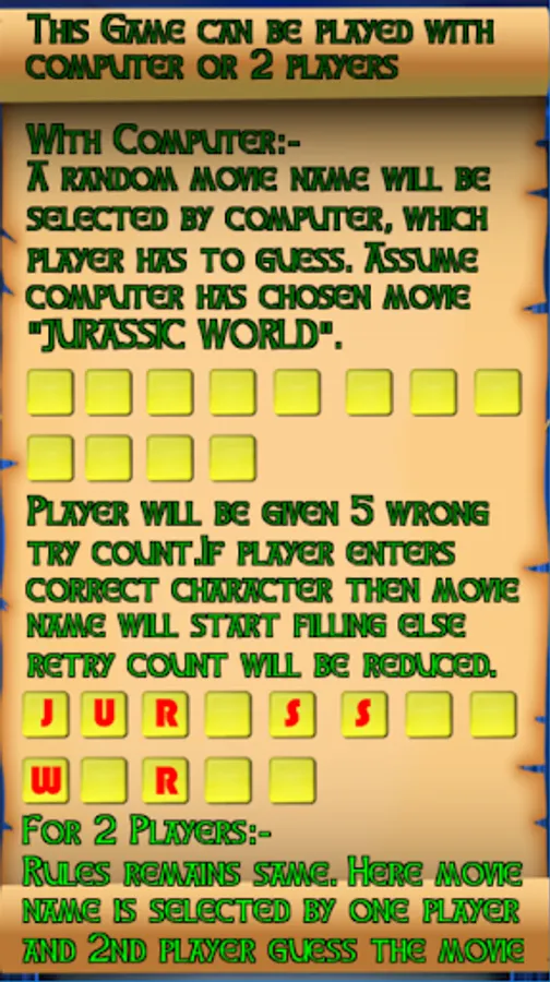 A random movie name will be selected by computer, which player has to guess. Assume