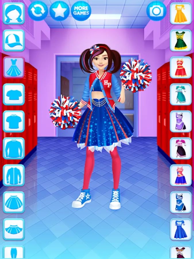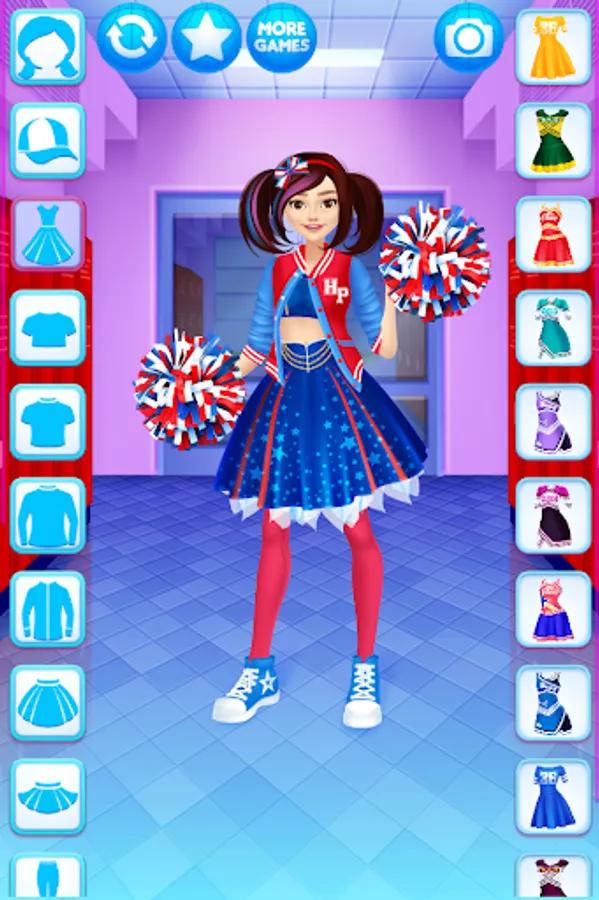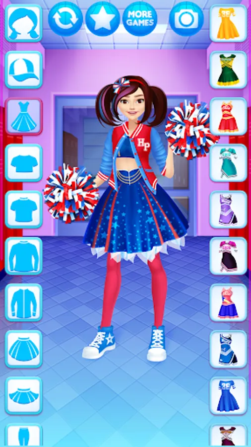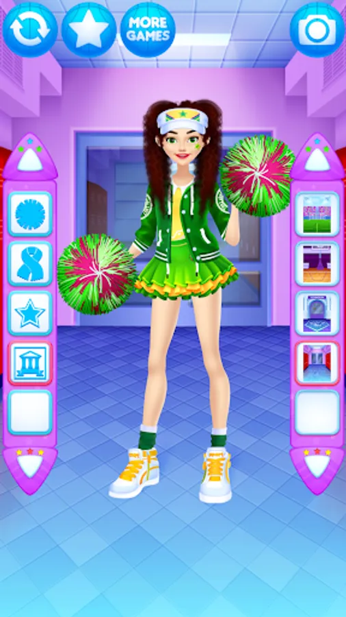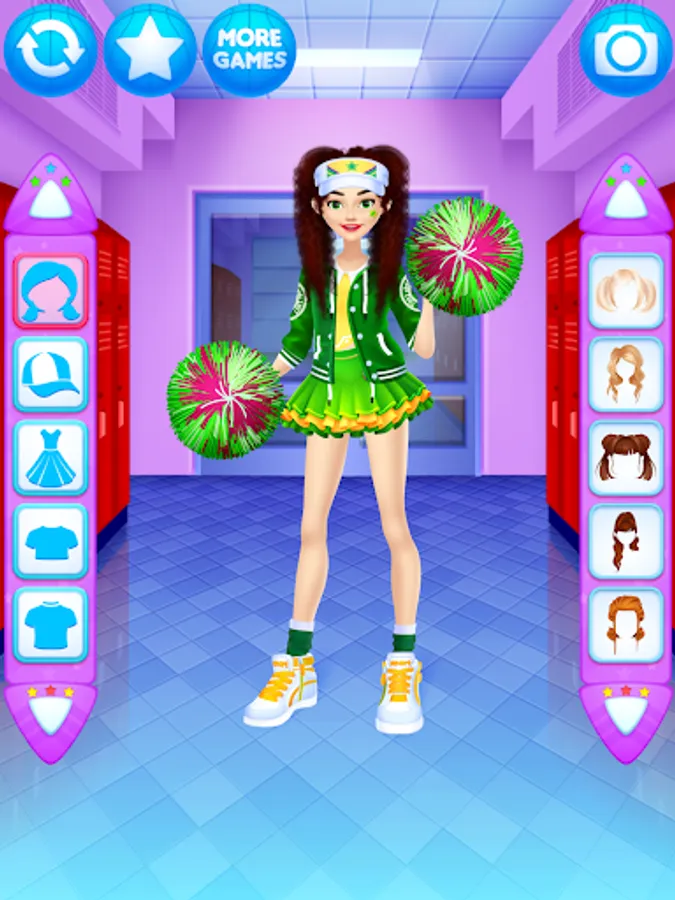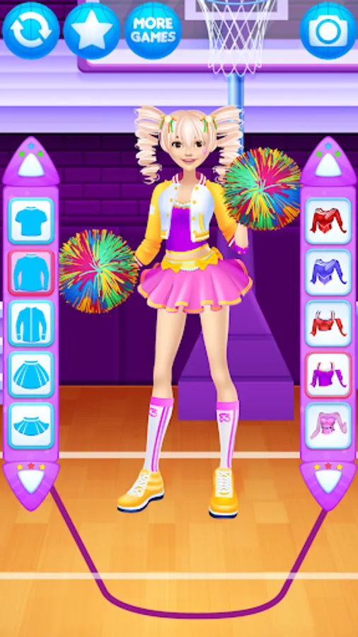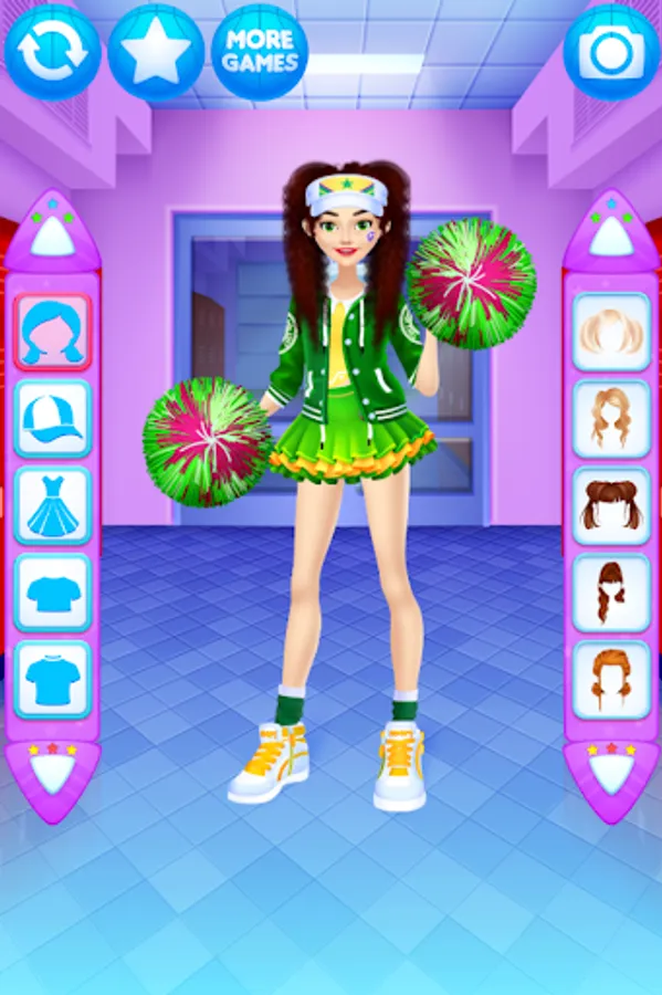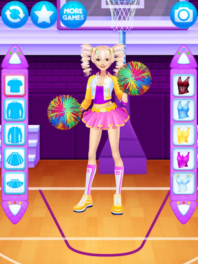 Dress up the cheerleader friends in new outfits. Find the ideal match of the tops with trousers, skirts, pompoms, shoes and other items for the girls.