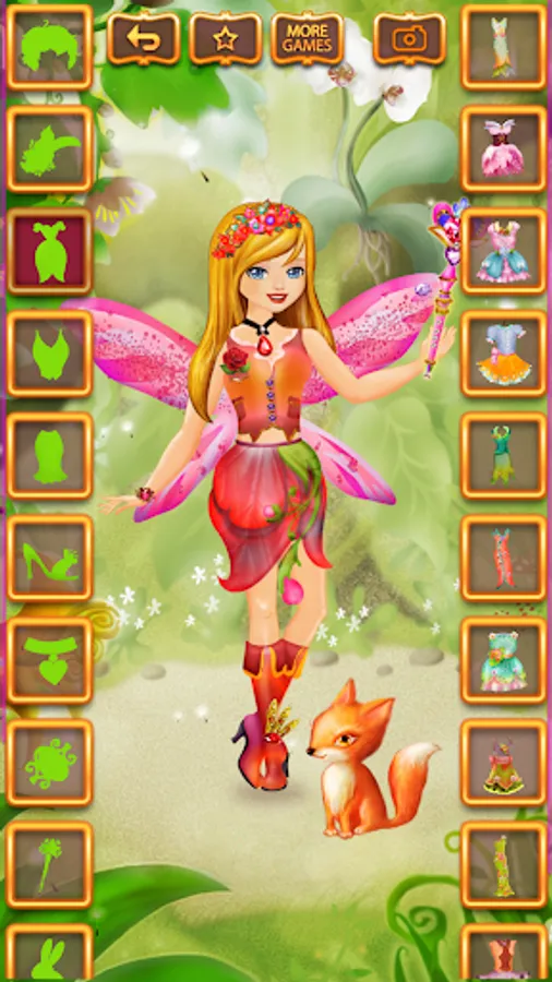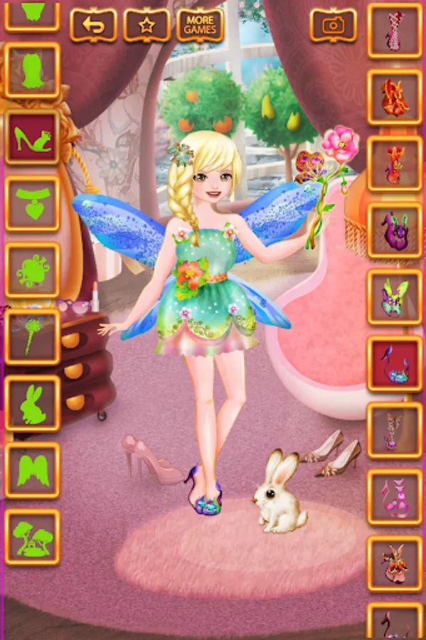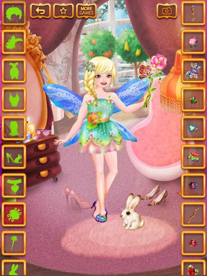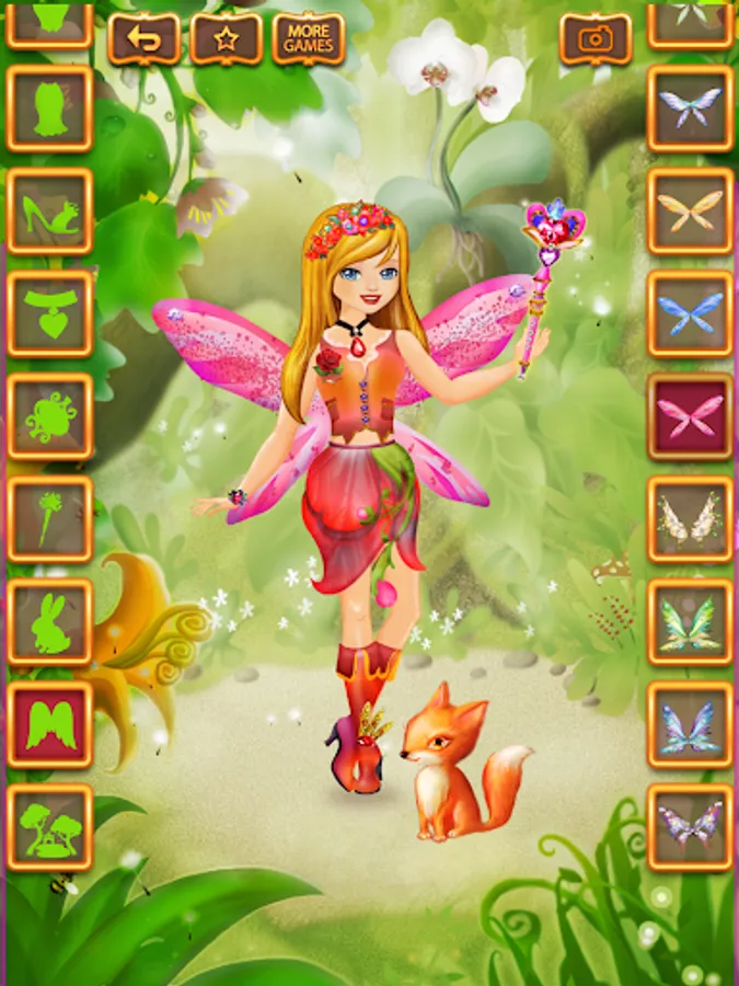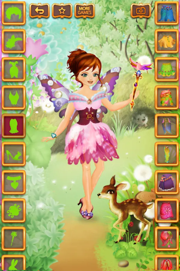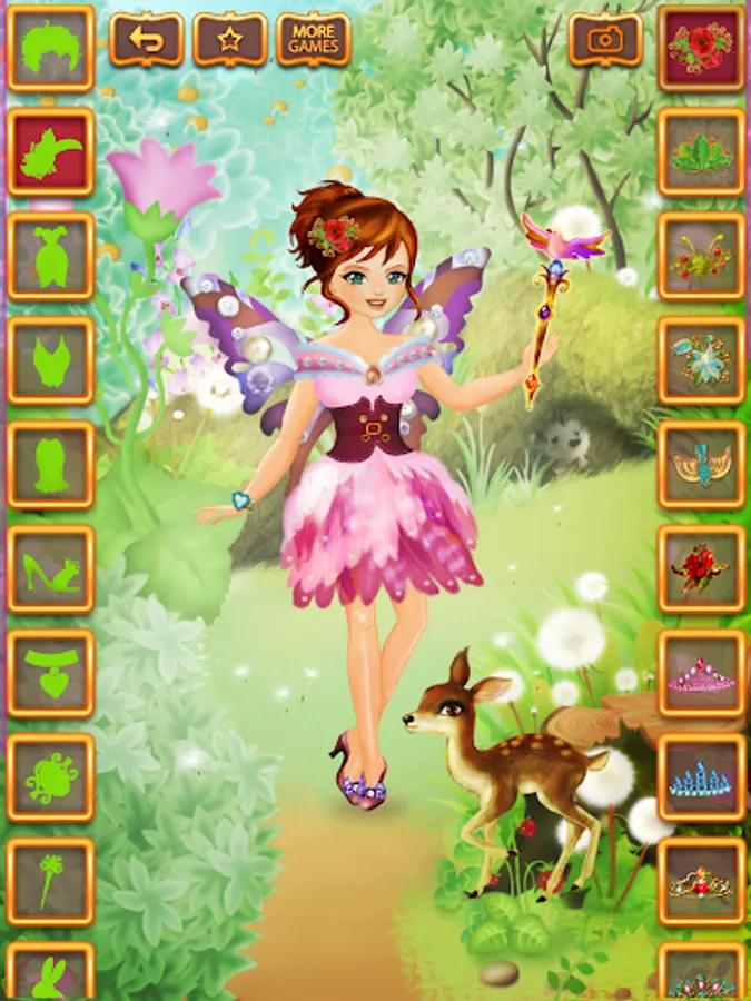 You can choose a pet: little deer, rabbit, owl, panda or fox. These adorable animals make your picture really awesome, process of dressing up fairies becomes even more interesting with them. In fairy dress up games for kids offline you can take a screenshot to share a magic makeover with your friends. Show off your imagination!