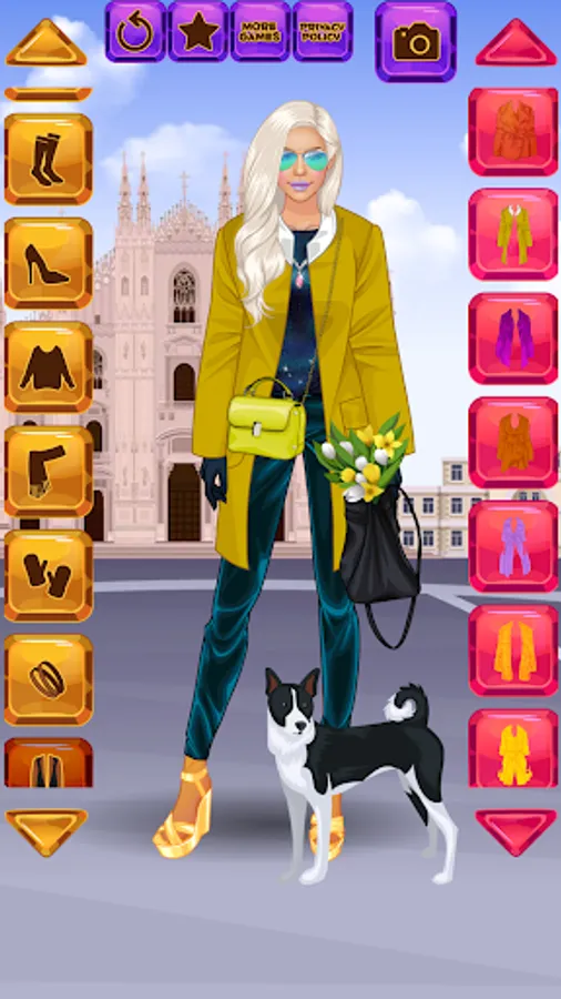 Express your fashionista talent and try out ideas for looks and outfits in this free dress-up / make-up simulator for girls and women. Create a unique face for the dolls from facial features (for the eyes alone you can separately choose eyelids, irises and eyeshades!). Select one out of a few dozen hairstyles. Then rummage through a huge of wardrobe of dresses, tops, skirts, trousers, jackets and coats. Tons of accessories await as well: scarves, necklaces, bracelets, handbags, and even a dozen of cute pets! Pick the background for each city: Eiffel Tower in Paris, Big Ben in London, Statue of Liberty in New York or the Milan Cathedral in Milan. Come up with an outfit, hairstyle and extras that fit the city's vibe the most!
