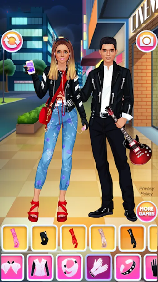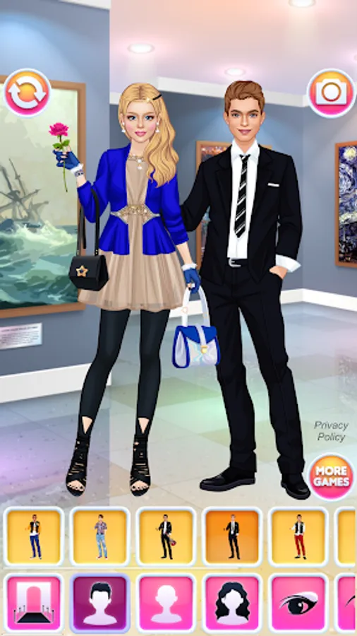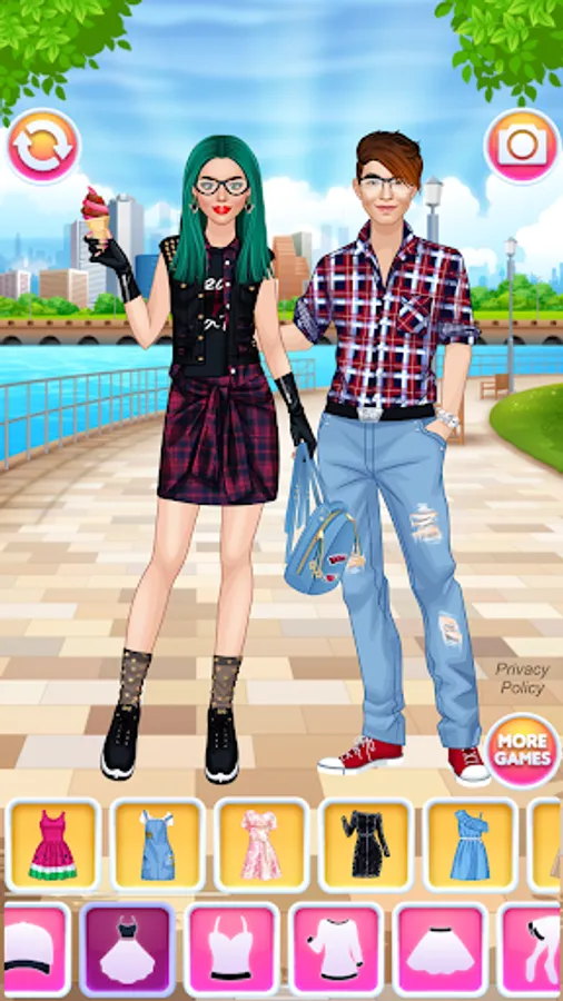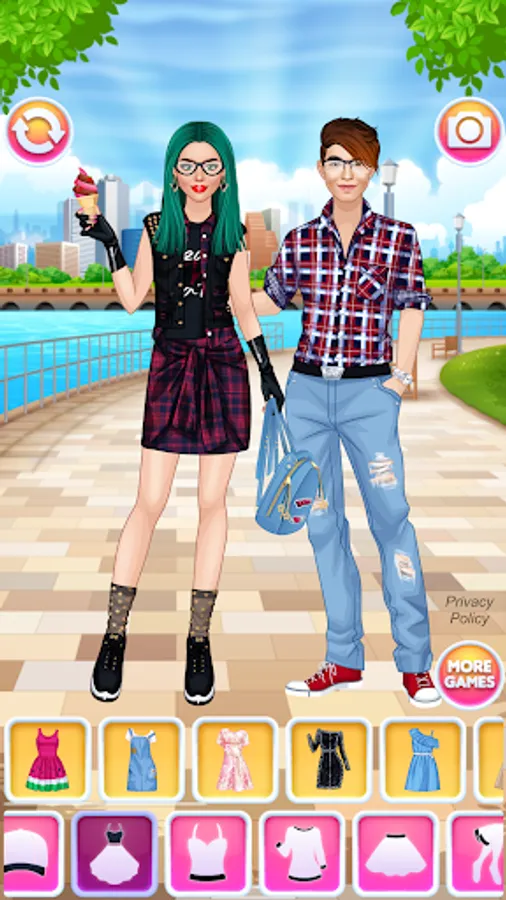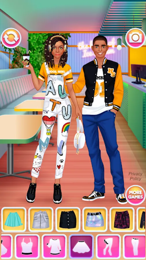 This new makeover game offers a stunning, 400+ items stong, selection of fashion design options for all fans of beauty and virtual cosplay. Rummage through dresses, tops, skirts, pants, jewelry, make-up, hairstyles, accessories - over 25 categories in total. Design millions of outfits: a cool popular girl, a geeky intelligent STEM nerd who will go to college, a career-oriented business student, a subculture adept with unusual piercings - you can style them all, and more. Young fashionistas will love the role of an outfit designer and image maker for the cute couple of teens.