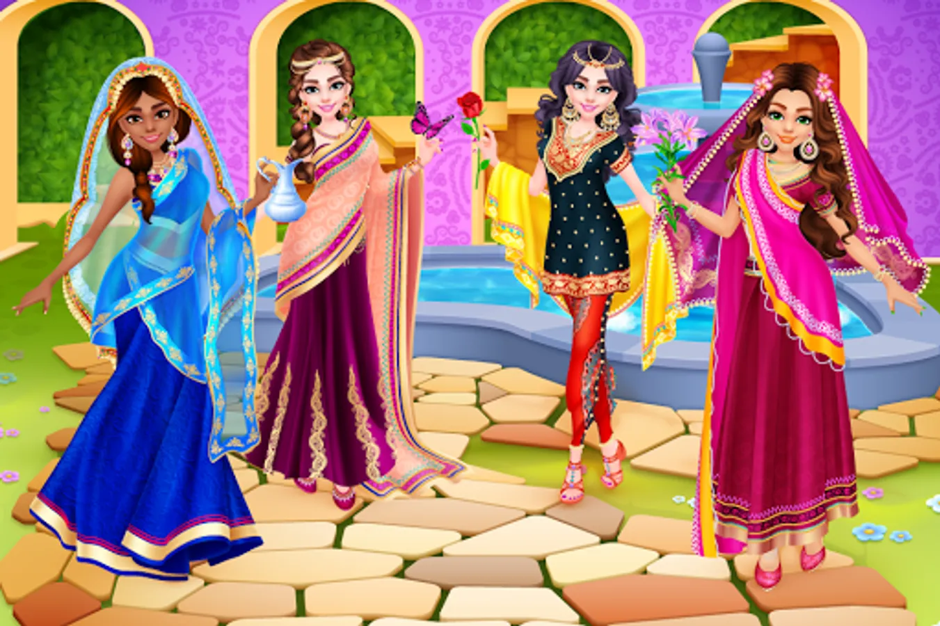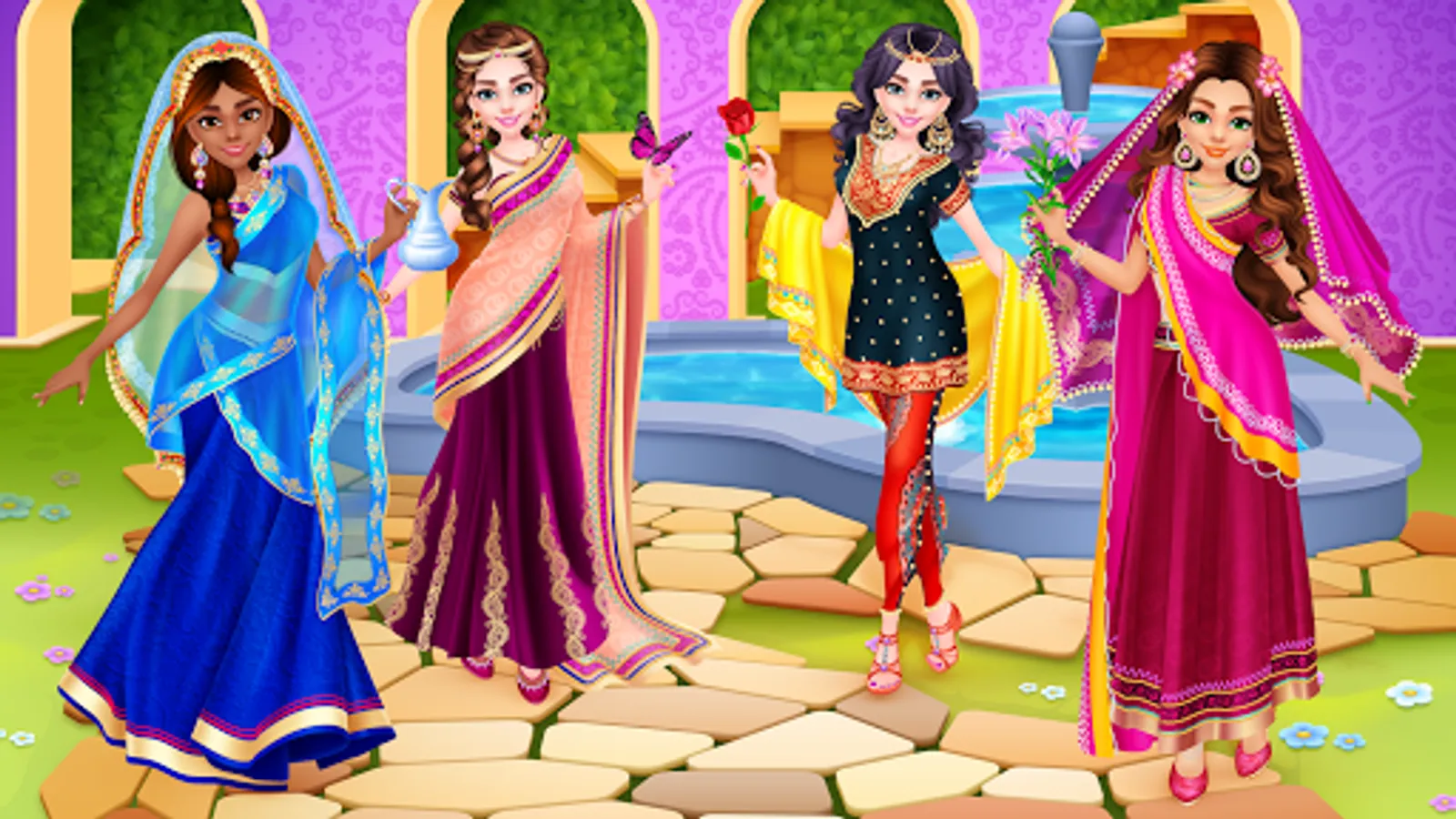 Design a unique outfit or a dancing costume for each of the girl princesses from over 200 items, accessories and hairstyles. Among them sari (saree), petticoats, and choli (ravike) blouses.