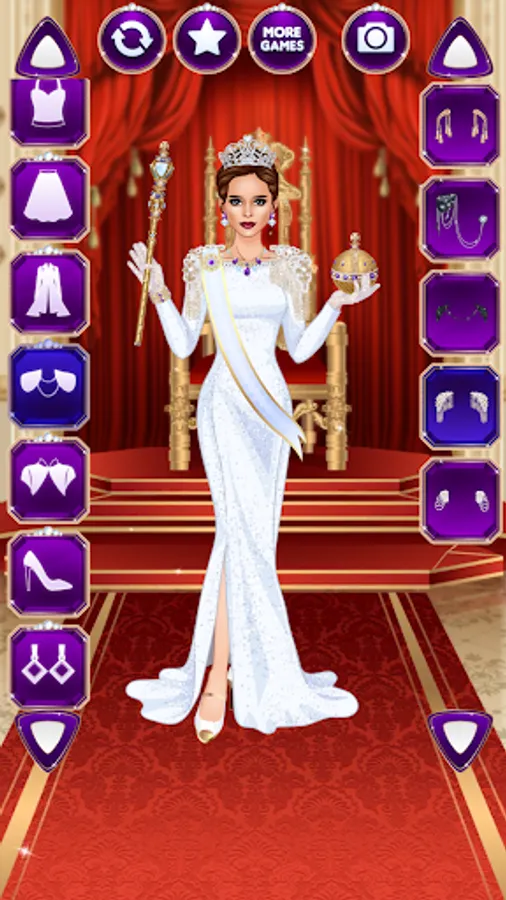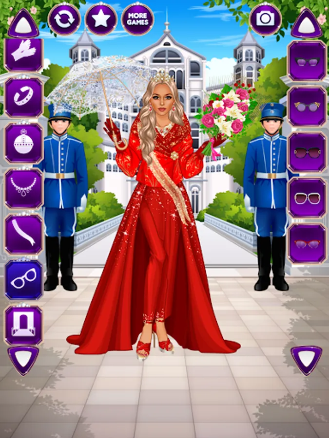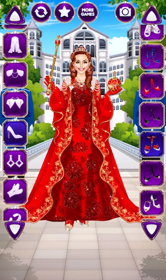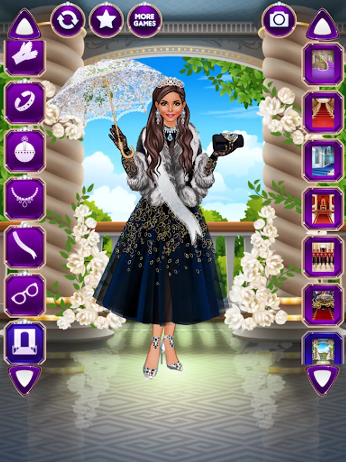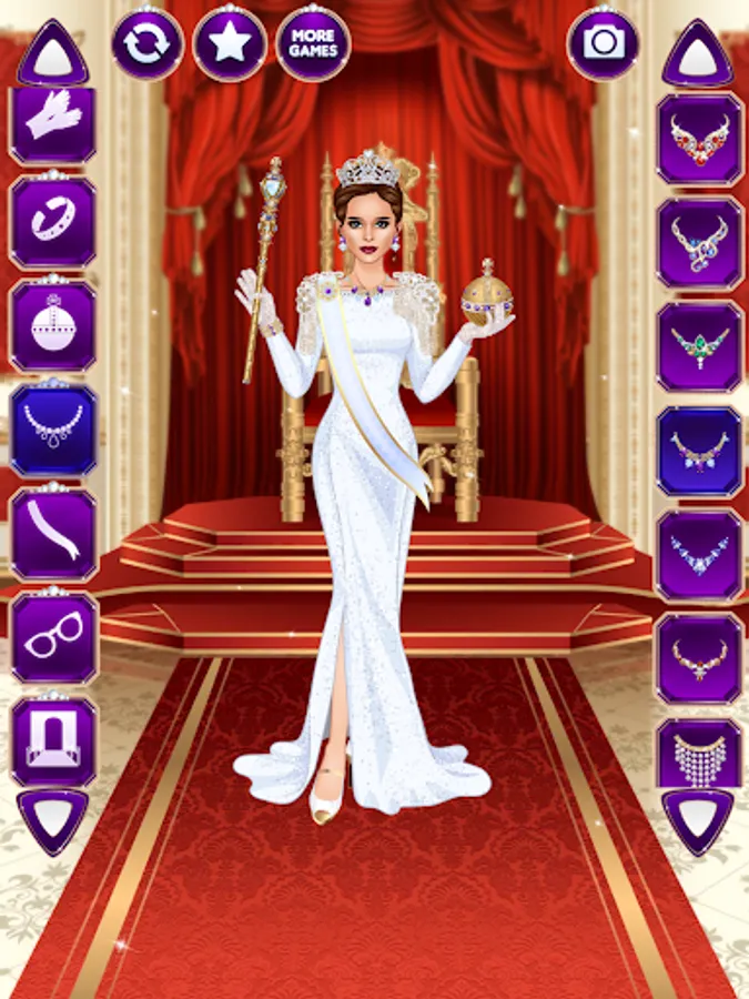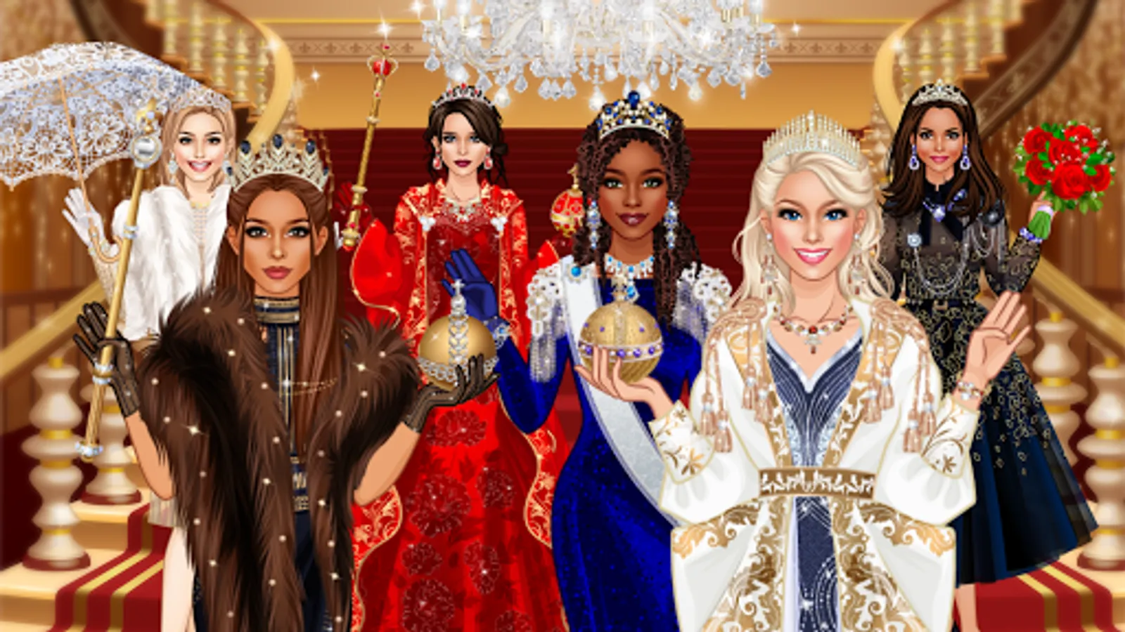 This app allows you to try over 150 apparel items in the aristocratic style on 6 dolls of different races. Many of the items are red - the traditional color of royalty in many cultures, but there are other colors, too. Among the accessories the game has those typical for a European monarch: the crown, the sceptre, the orb, and the mantle.
