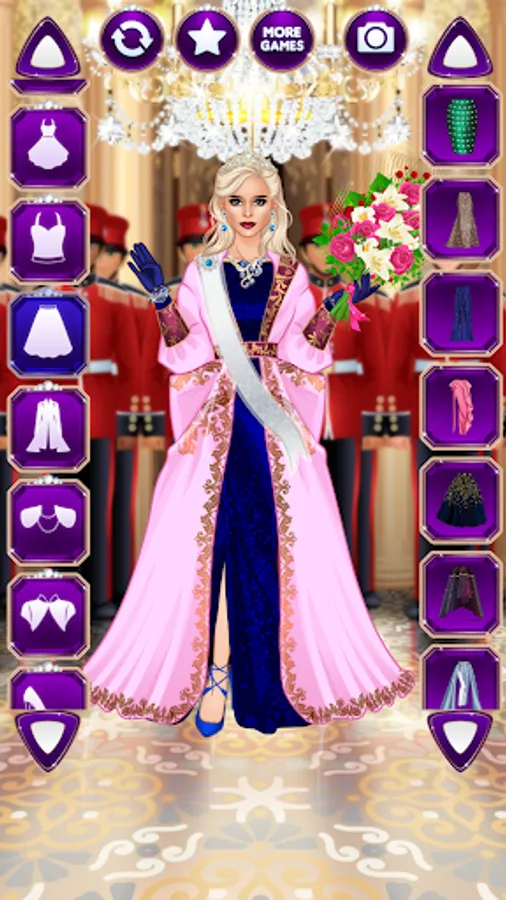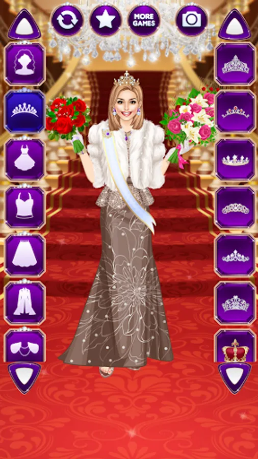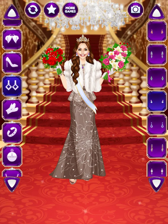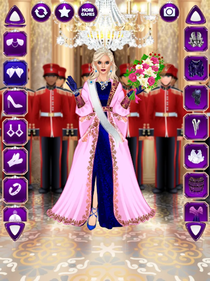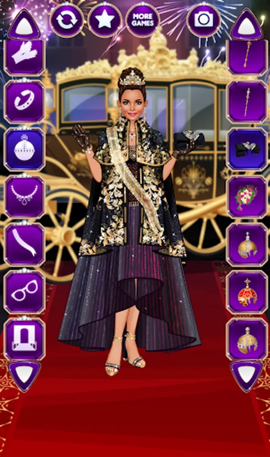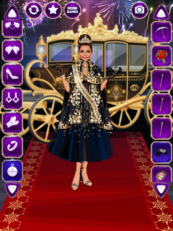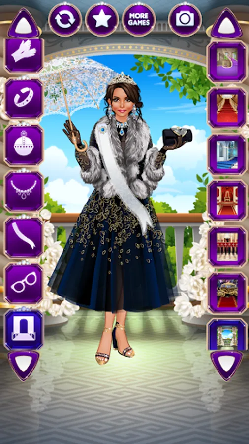 This app allows you to try over 150 apparel items in the aristocratic style on 6 dolls of different races. Many of the items are red - the traditional color of royalty in many cultures, but there are other colors, too. Among the accessories the game has those typical for a European monarch: the crown, the sceptre, the orb, and the mantle.