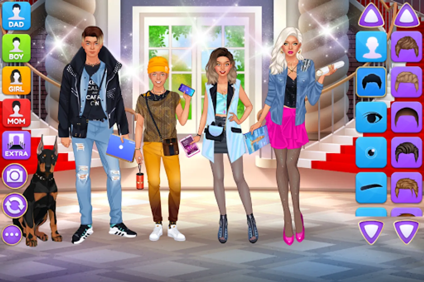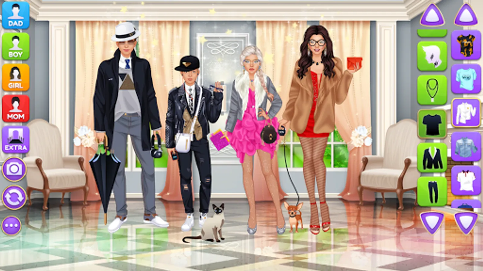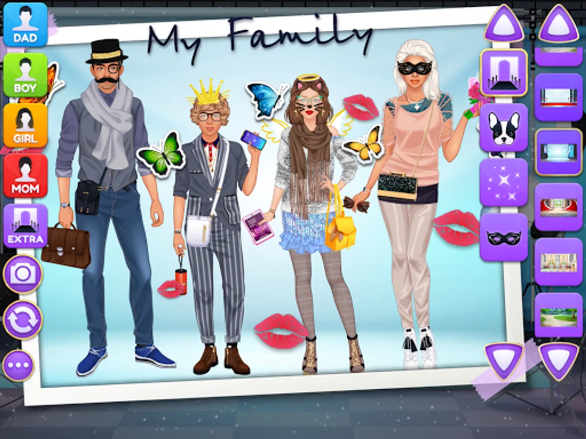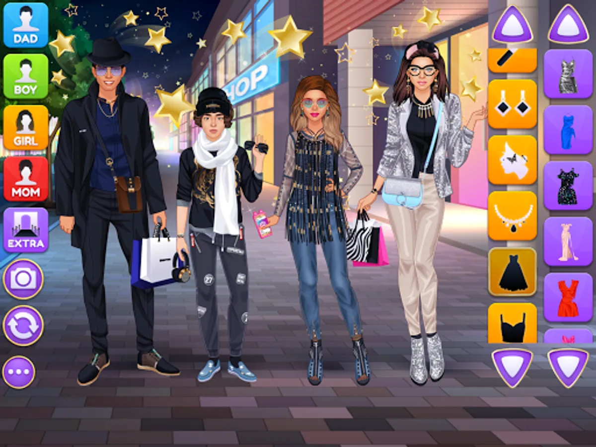 Design luxury outfits and amazing looks for a superstar family of 4 gorgeous virtual models on the same screen! Each character have their own wardrobe with 200+ items of apparel, makeup and accessories. Add cute pets, fireworks and various cool stickers to get the final picture ready for a photo album. Grab a screenshot by pressing the "Camera" button inside the game and share the picture with your friends and family online to show off your fashionista talents.