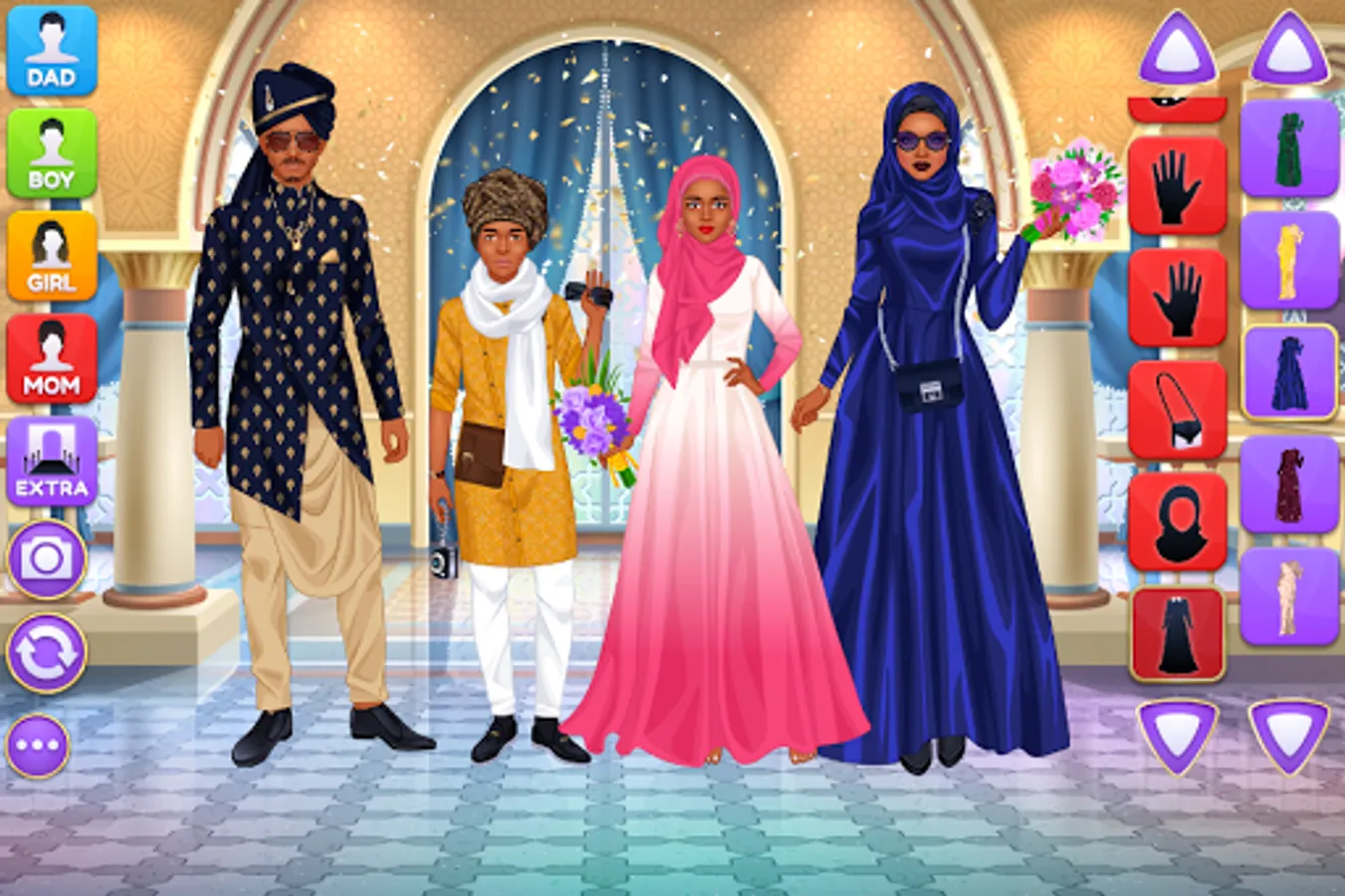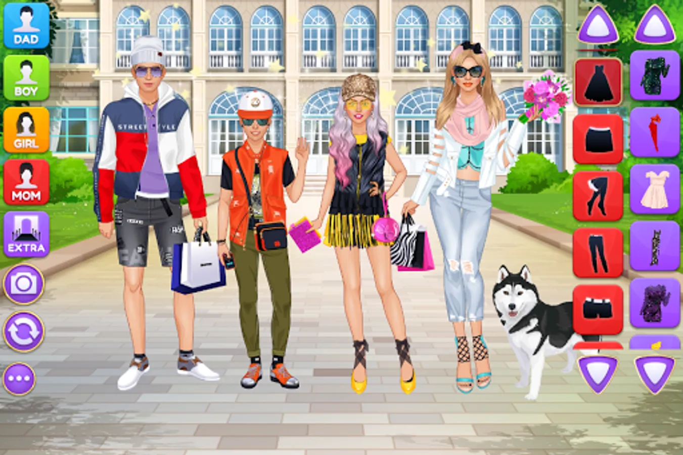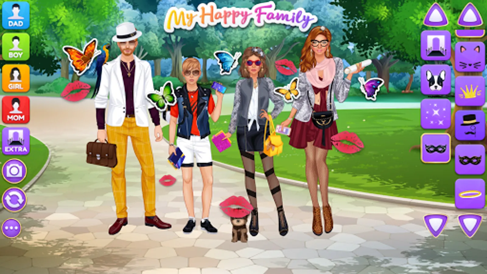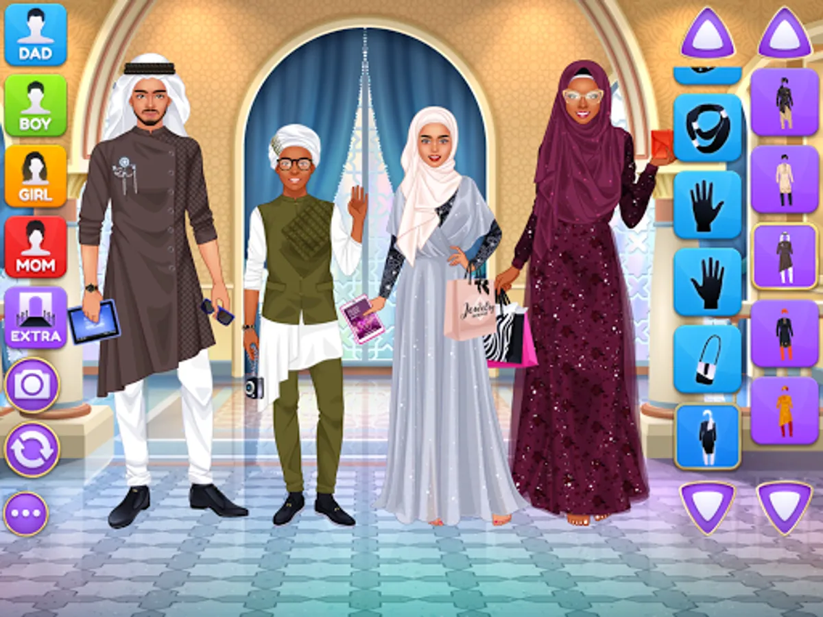 Design luxury outfits and amazing looks for a superstar family of 4 gorgeous virtual models on the same screen! Each character have their own wardrobe with 200+ items of apparel, makeup and accessories. Add cute pets, fireworks and various cool stickers to get the final picture ready for a photo album. Grab a screenshot by pressing the "Camera" button inside the game and share the picture with your friends and family online to show off your fashionista talents.