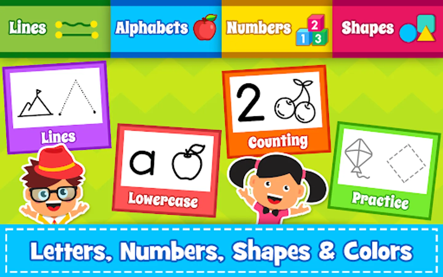 ABC Learning apps for kids with tracing and phonics games. Learning of English letters, numbers, Shapes, curves, slanting lines, straight line, simple lines and free drawings, colors and more other basic vocabulary. Any toddler, kindergartner or preschool age child can learn English and the English alphabet and numbers simply kids tracing letters by following their finger