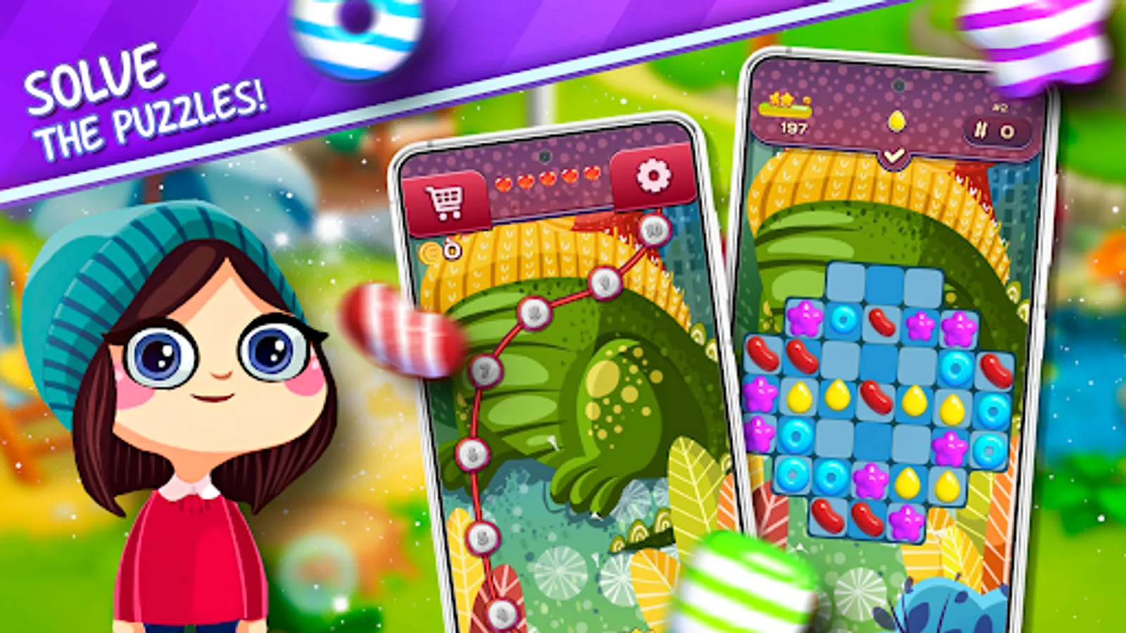 Match, pop, and blast candies in this tasty puzzle adventure to progress to the next level and get a sugar blast! Master match 3 puzzles with quick thinking and smart matching moves to be rewarded with sugar bonuses and tasty candy combos.