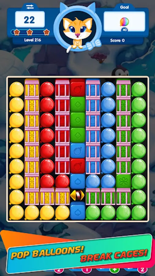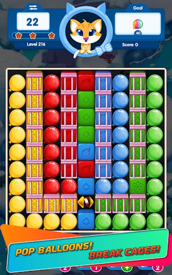 + Pop colored balloons and boxes by smashing blocks of the same color.