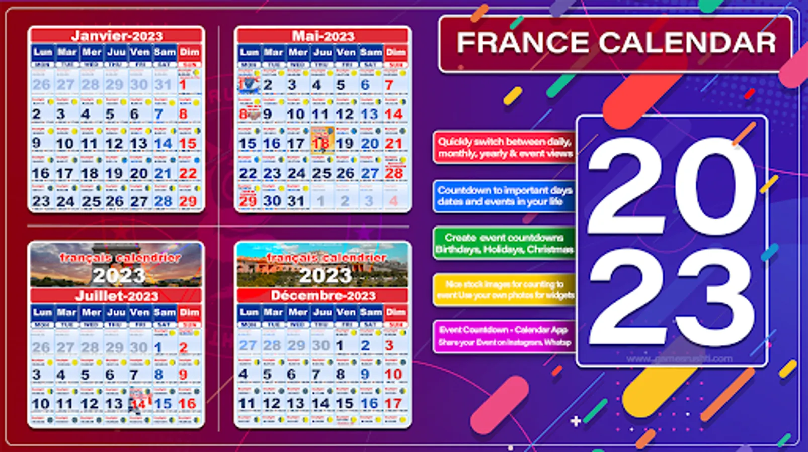 Français Calendrier is a calendar application that includes a holiday until 2023 that applicable in Français