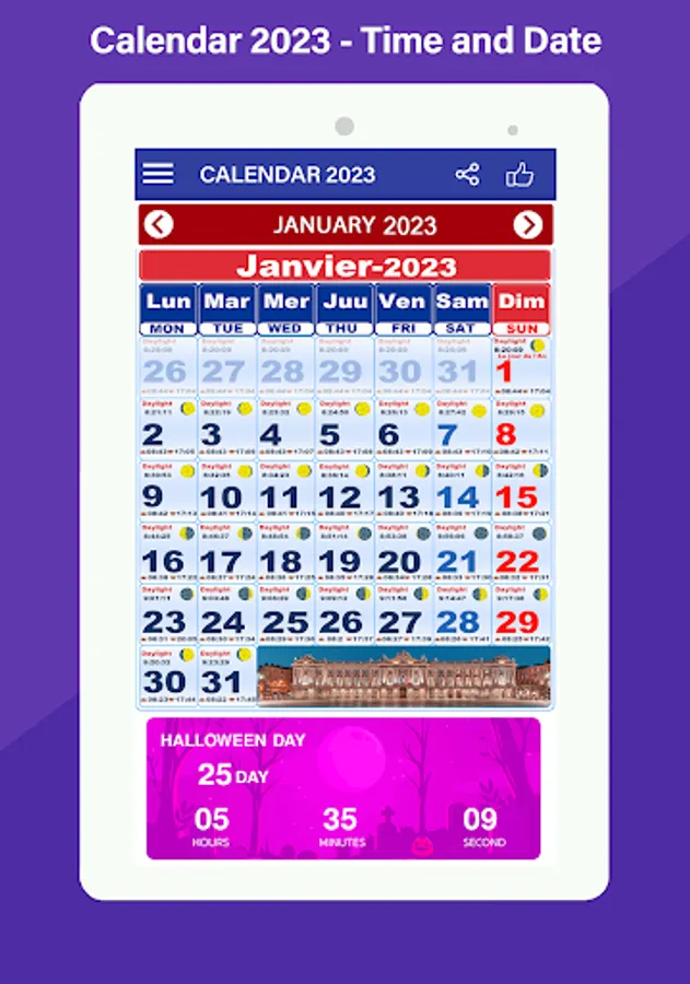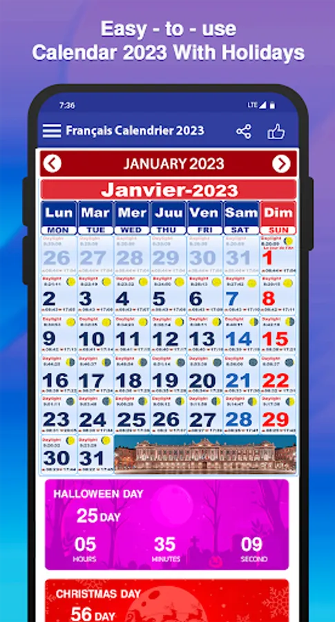 In this Français Calendar 2023 appTime of Sunrise and Sunset on daily base for your 2023 you can get National Holidays list for the year 2023.