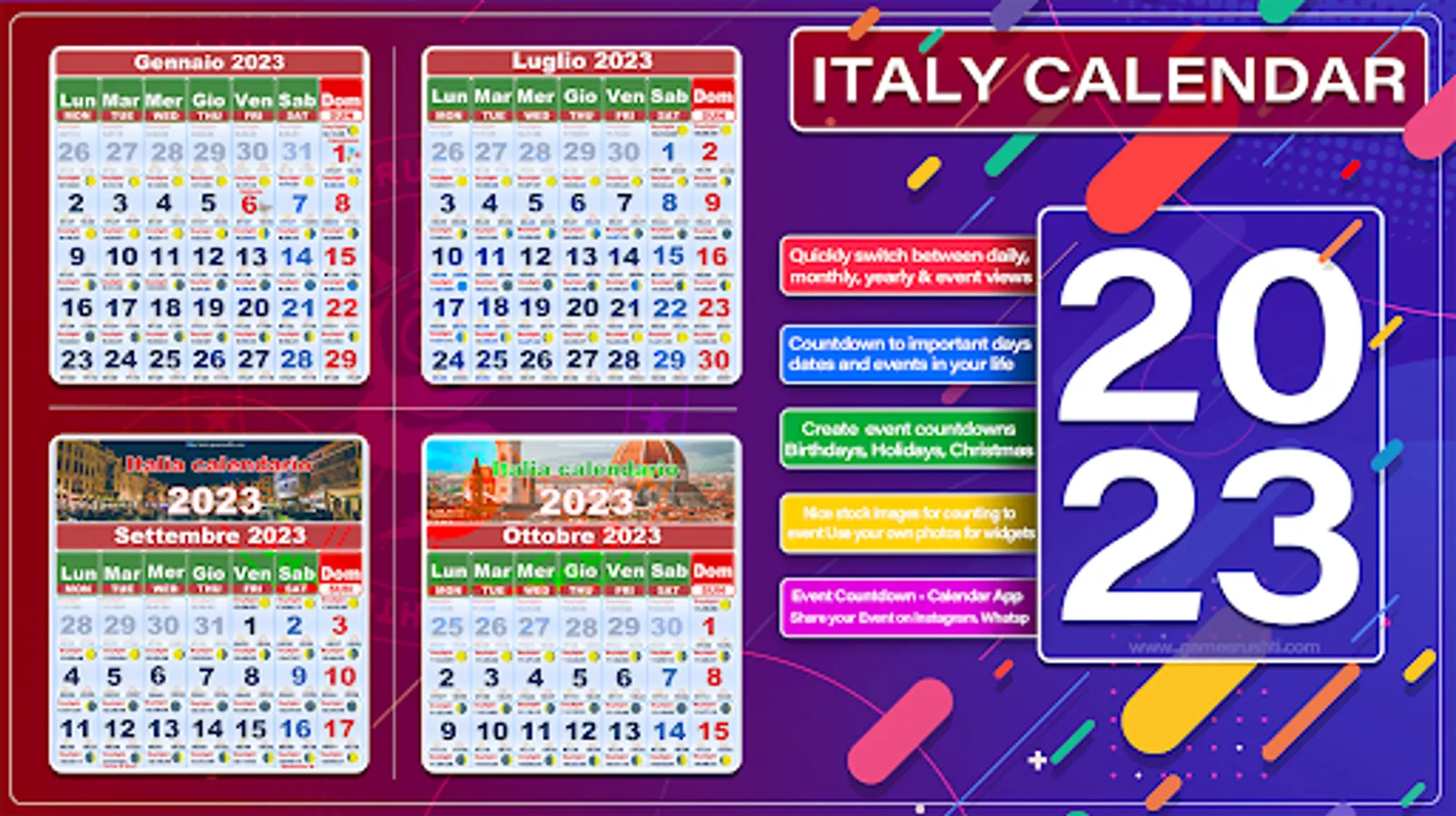 * In this Italia Calendario 2023 have all the festivals around for year Calendar 2023. These festivals can show in Countdown mode as well.