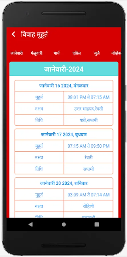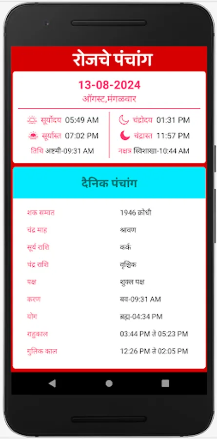 मराठी कॅलेंडर 2024 मराठी बोलणार्या लोकांसाठी सर्वोत्तम भारतीय कॅलेंडर आहे. गव्हर्नमेंट हॉलिडे, त्यौहार, सुट्ट्यांची यादी देतो. शुभ दिवस (विवाह, नामांकन, वाहन खरेदी, गृह प्रवेश) देण्यासाठी देखील अॅप मदत करतो. मारती पंचांग अॅप म्हणून अत्यंत शिफारसीय. रशी नक्षत्र तपशीलवार सर्व कुंडलीचे तपशील