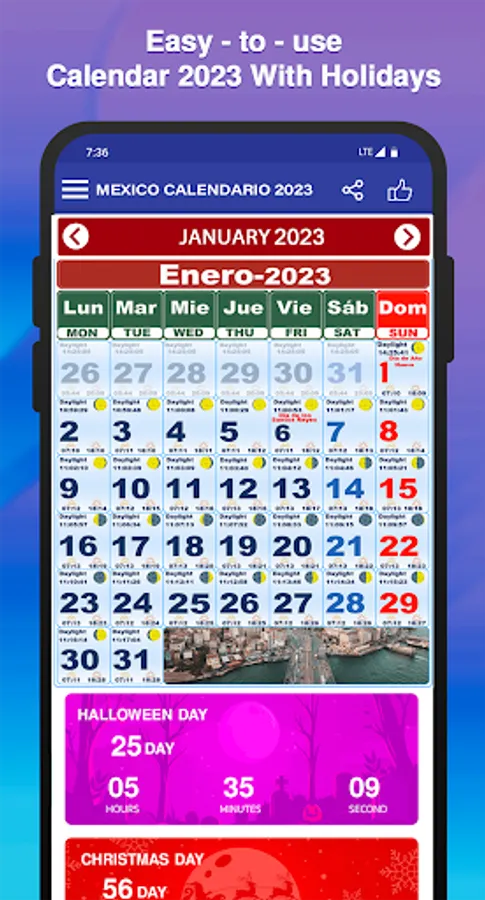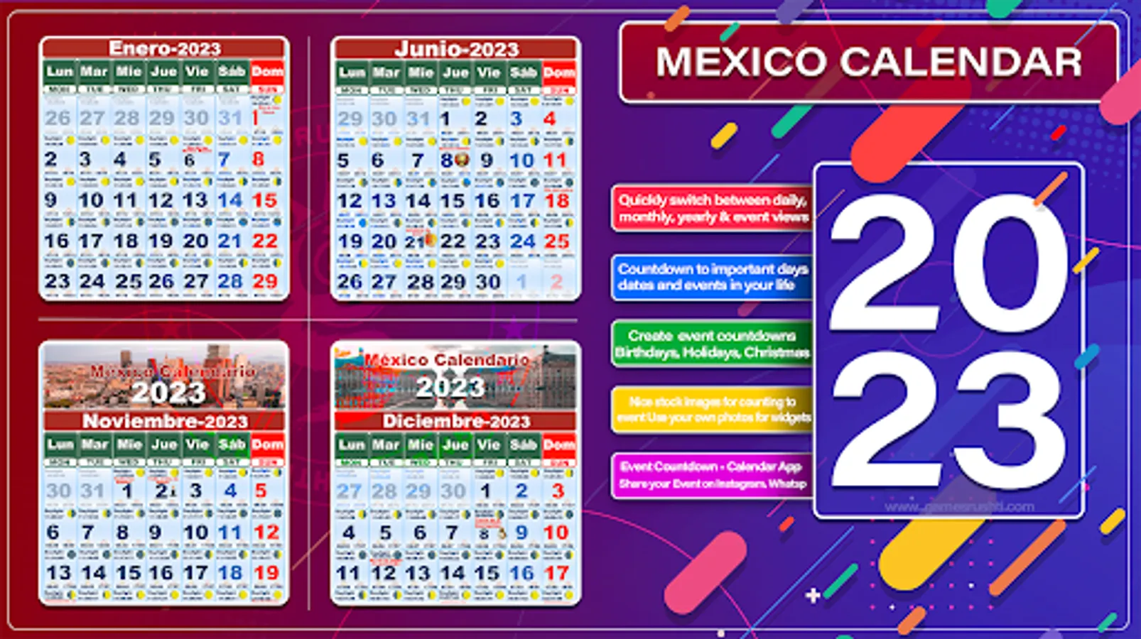 Using Mexico Calendario 2023 Easy for you to stay up to date and organised every day. Mexico Calendario 2023 Countdown app that supports Daily Weekly, Monthly and yearly Calendar functions.