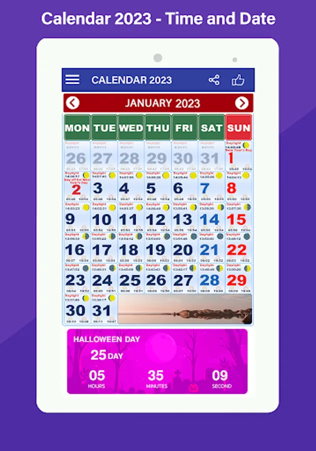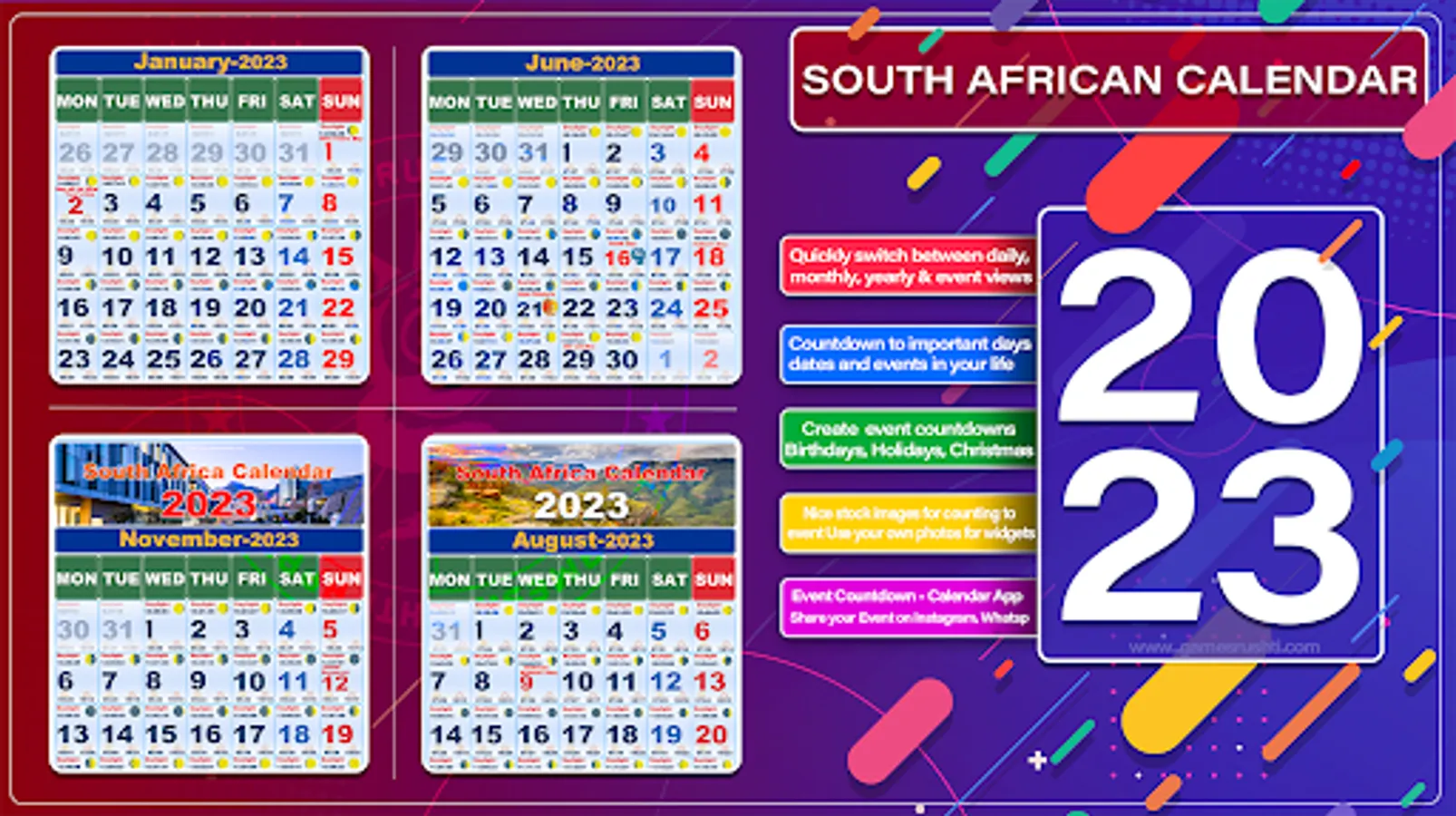 South Africa Calendar 2023 is the app that helps you in your daily life. If you need help Set Countdown reminders for the Events app is perfect for you