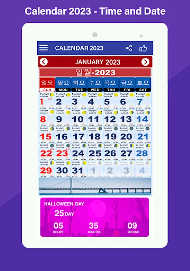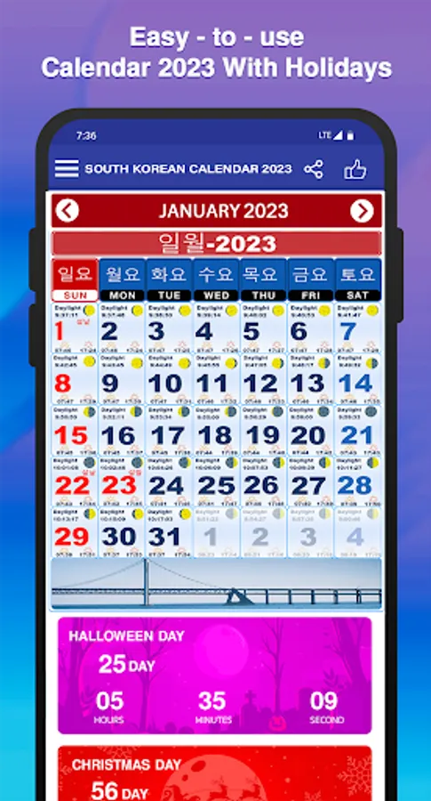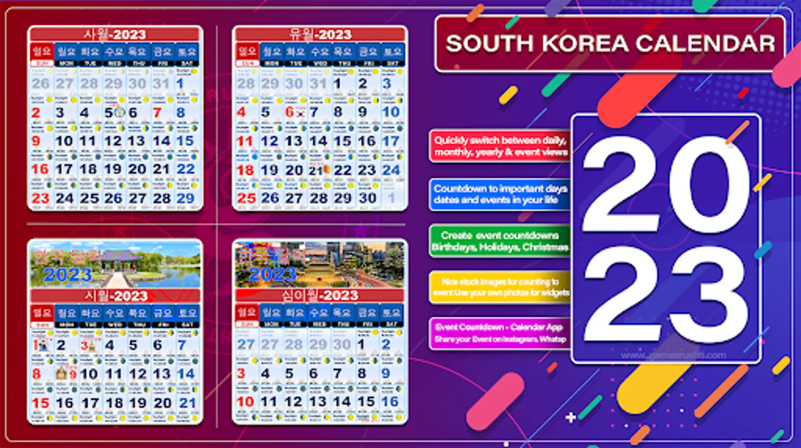 In this South Korean Calendar 2023 have all the festivals around for year Calendar 2023. These festivals can show in Countdown mode as well.