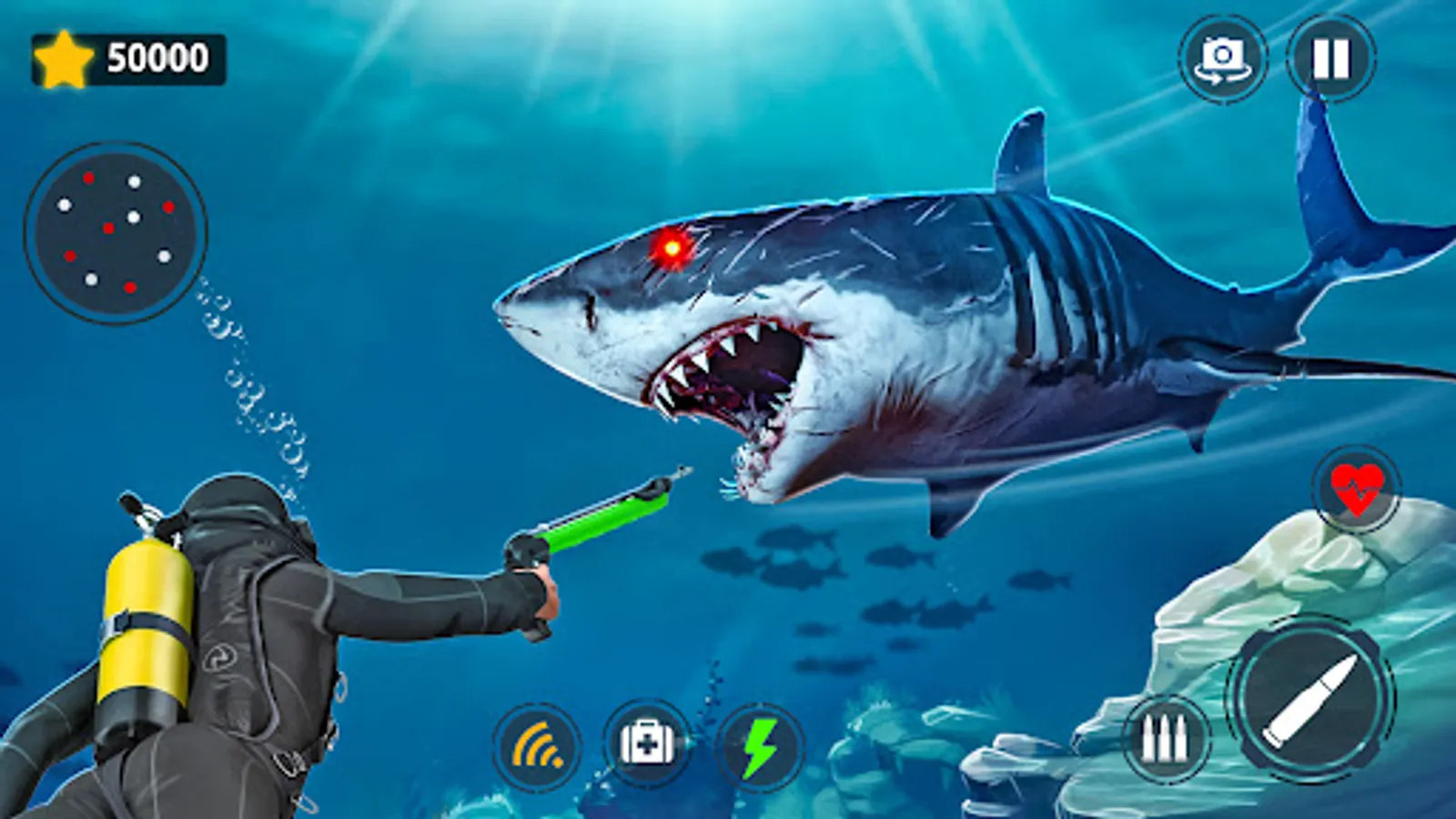 Thrilling shark hunting gameplay with realistic shark jaws animations and challenging underwater battles.