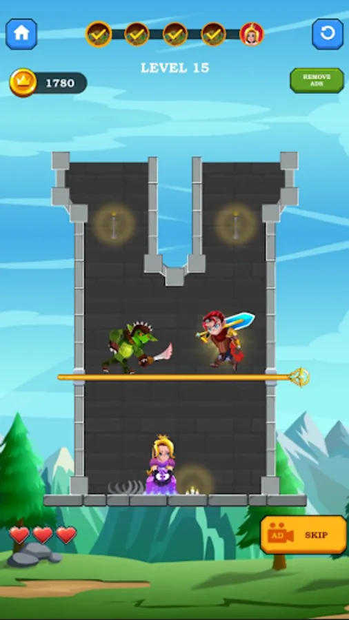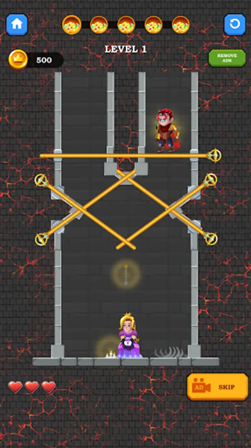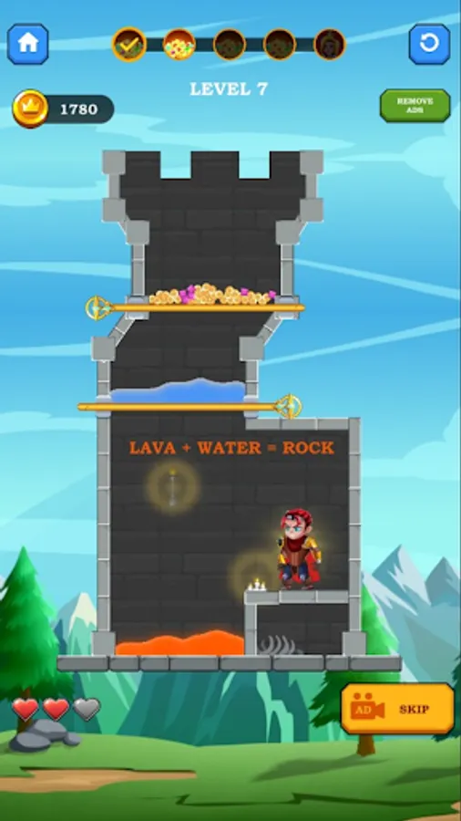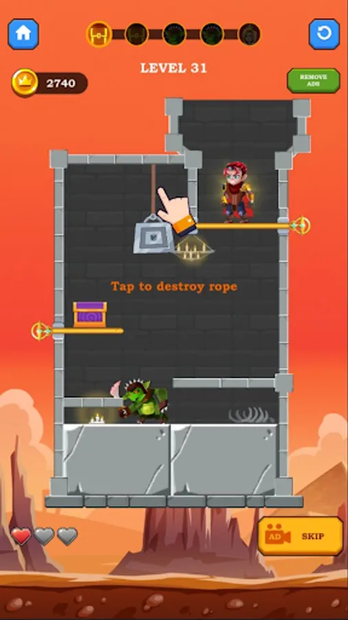 Solve puzzles and rescue the hero, collect all the treasures, kill monsters and save the princess. Pull the pin in order to destroy your enemies by pulling lava and poisonous gas into their puzzle units. Cut the ropes in order to rescue the princess from the scary