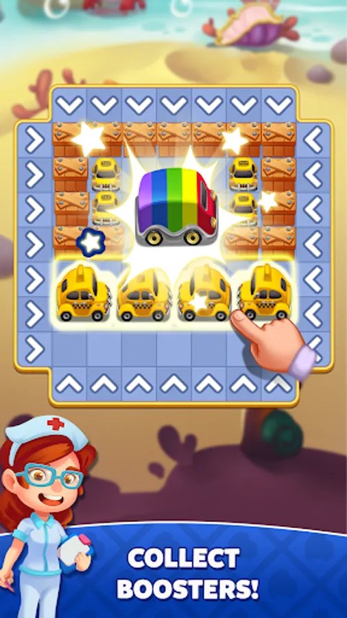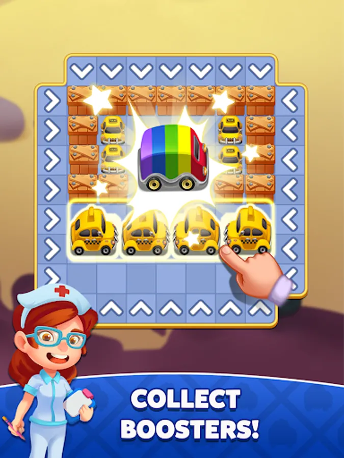You will enjoy this traffic puzzle game with plenty of vehicles such as Police Car, Rainbow Bus, Town Truck, Ambulance, Helicopter, and Train. Collect amazing boosters and daily rewards from the wonderful traffic game. Beat all the car puzzles to unlock infinity levels.
