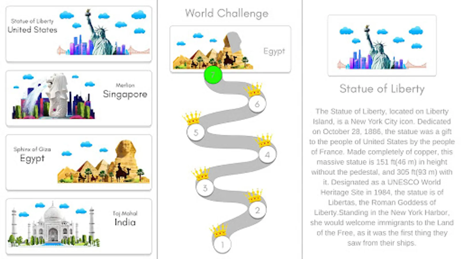 - Play country challenge and reveal famous tourist spots and monuments and know about them