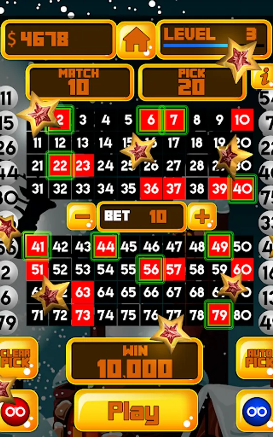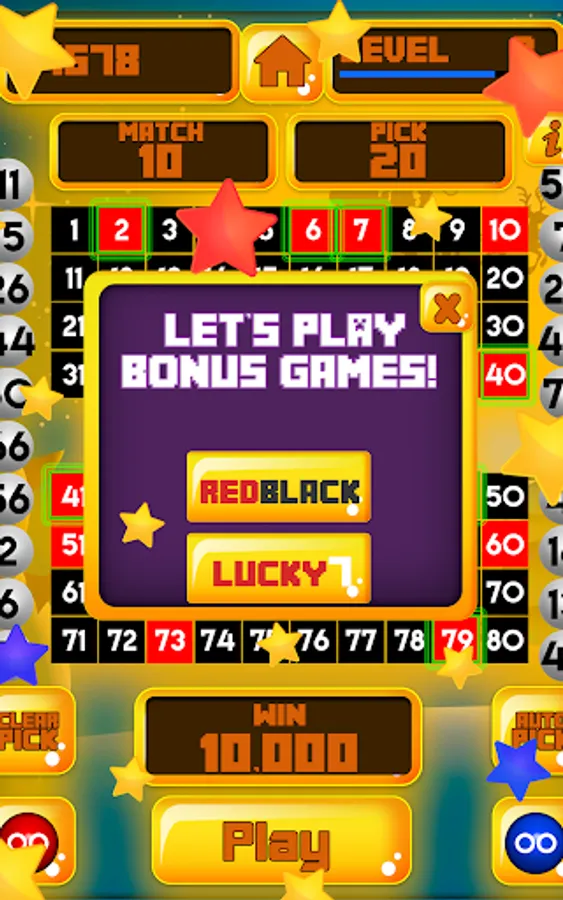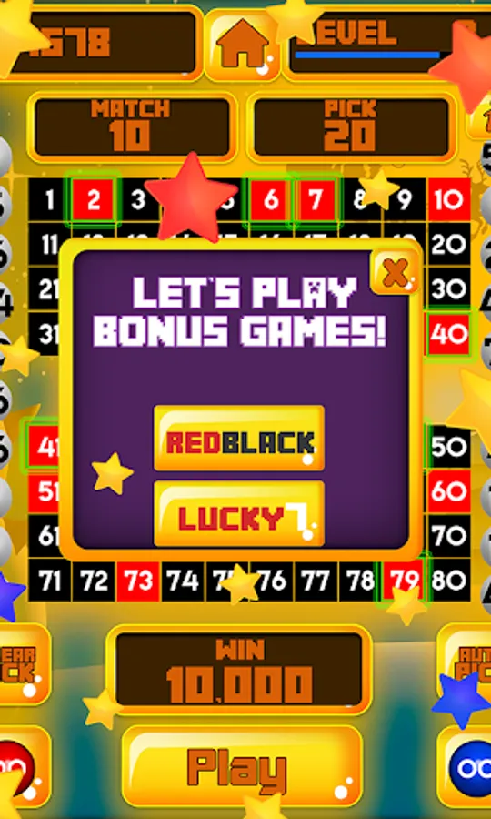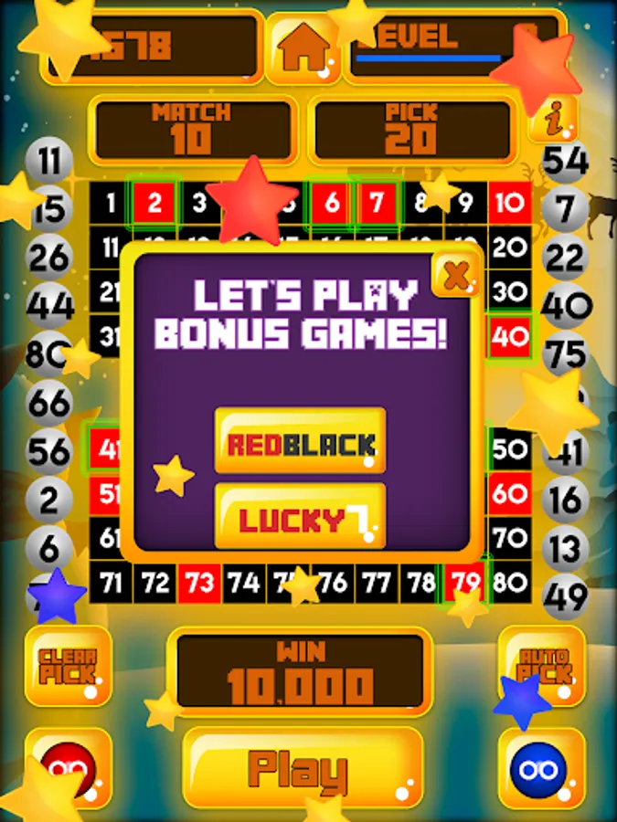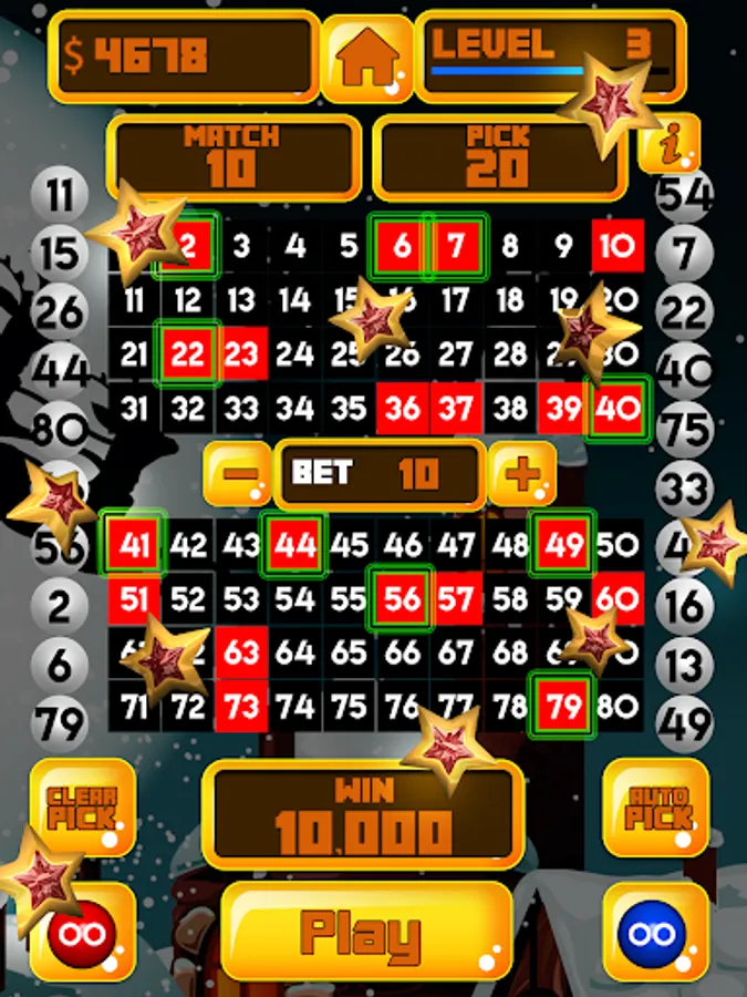 Choose between 1 and 20 numbers from the 80 displayed on the main grid. The computer then chooses 20 random numbers and if they match any of your numbers then you WIN. with different odds. Level up to bet more and win more.