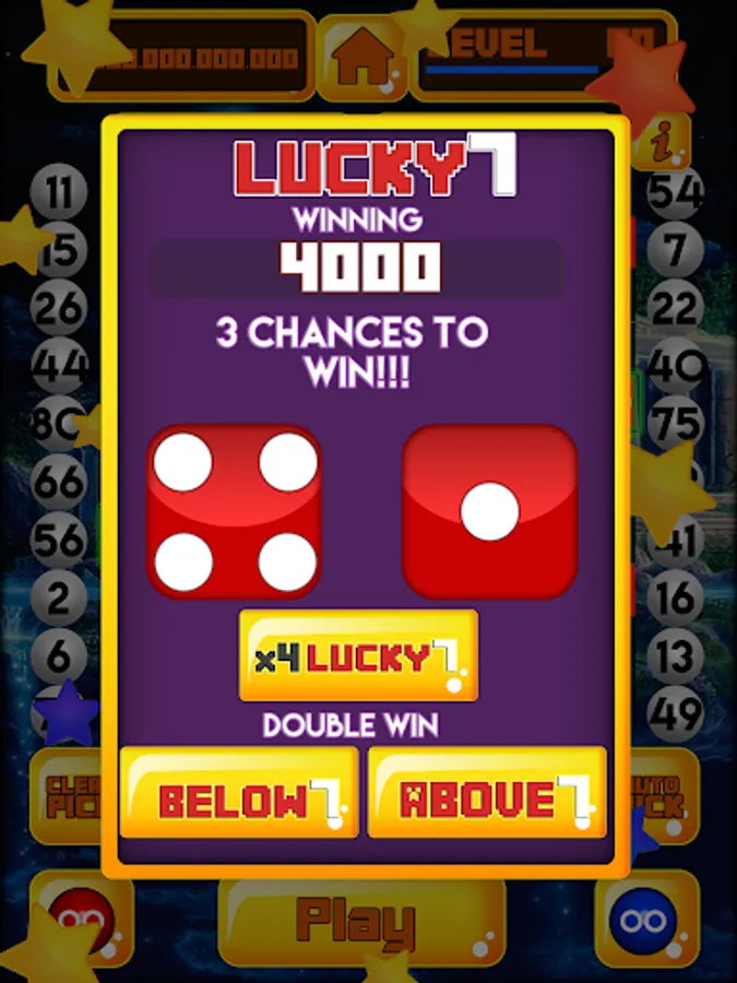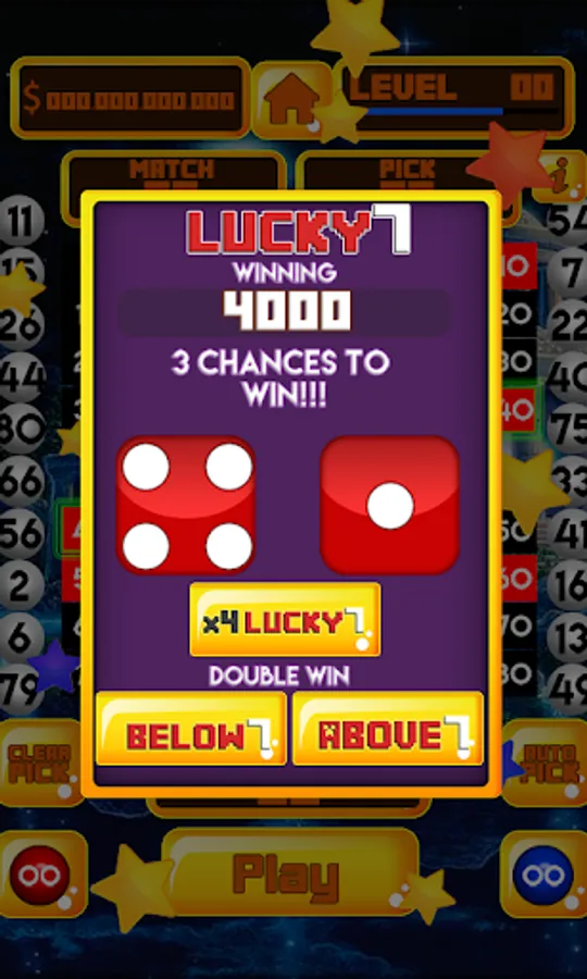 Lucky 7 Dice three tries to win. Select above 7, below 7, or