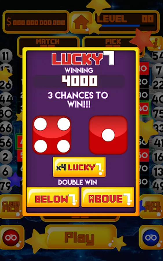 lucky 7. roll 2 dice and add the value on both dice for result. Lucky 7 x4 - above and below 7 X2