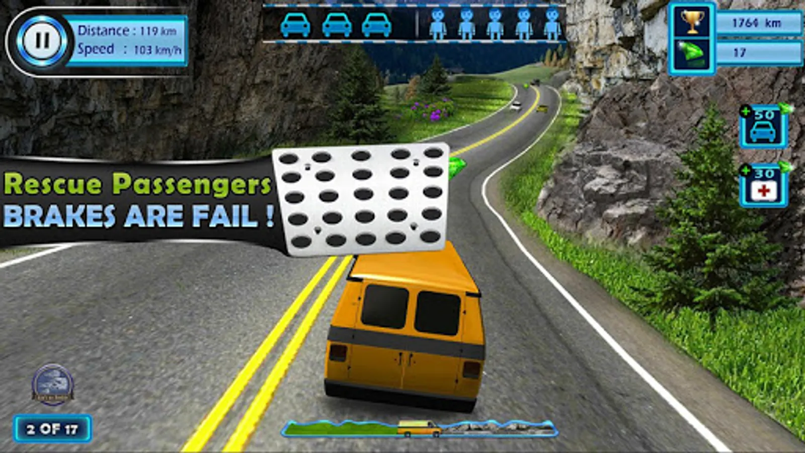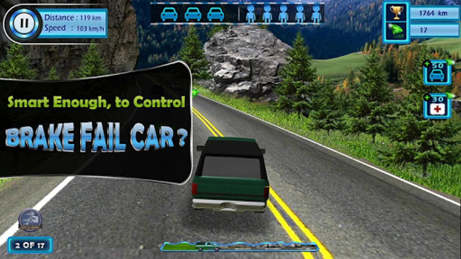 There is a mountainous road and a car. This car don’t have brakes so user have to rescue the car by saving car from accident and bring it to ground after driving of few kilo meters.