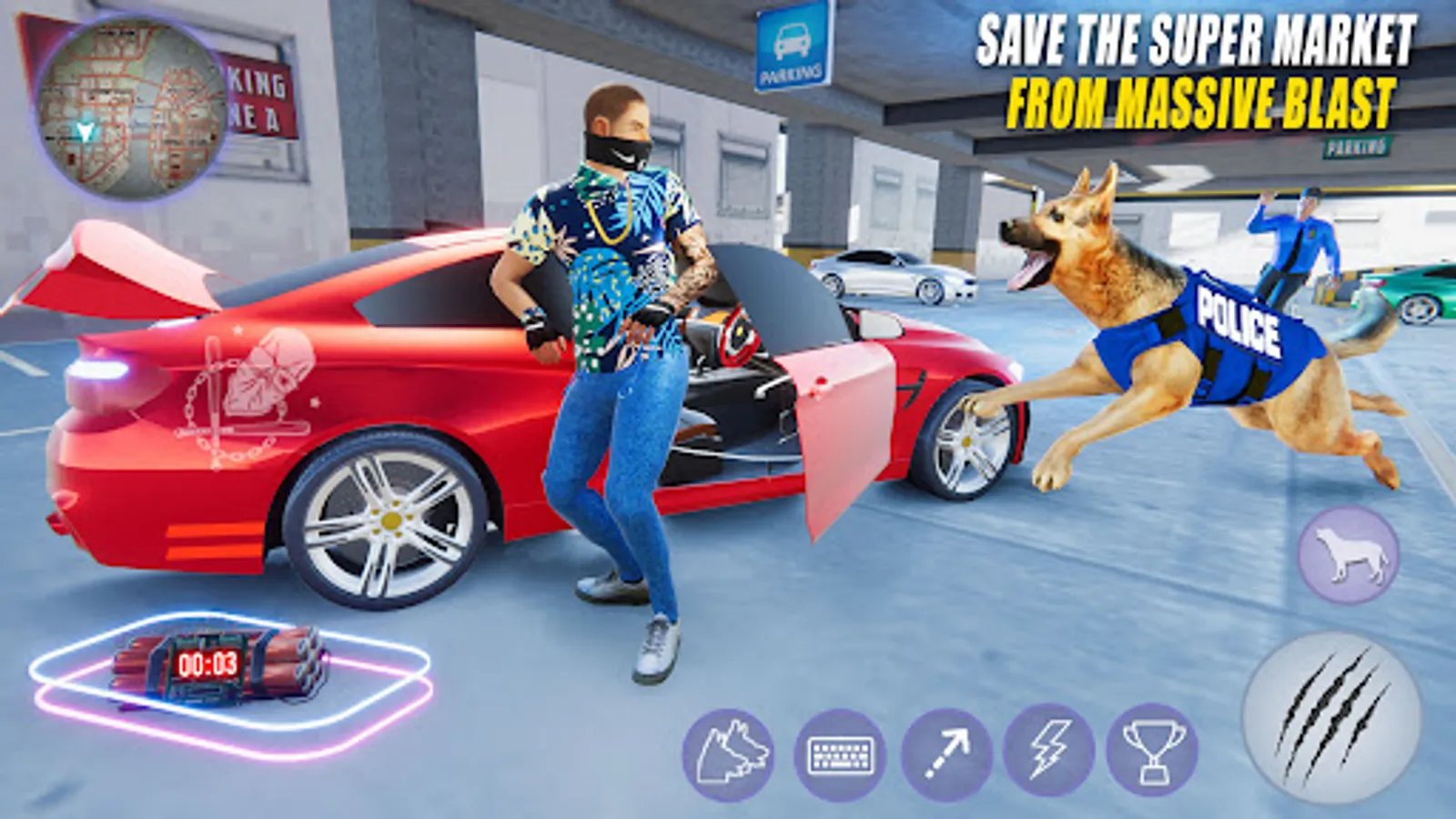 Welcome to the ultimate Police dog supermarket chase game 2022, An trained professional Police Dogs will rule the game & chase the real gangster & robbers in SuperMarket of NY City Police crime shooting game. Don't let the robbers escape from the Supermarket & Shopping Mall criminal,so chase them quickly and evade crime from NY city in this Police dog chase supermarket simulator. Some City thug criminals are trying to explode the Supermarket & Parkisng area, so as an Brave Police officers hero eliminate all those vegas gangsters in this NY City Police crime shooting game.Best part is in Police Dog Supermarket Crime Chase Game, here you can do many missions and roam in parking area of Supermarkets, Family Parks & High schhols to ensure the security in this Police Dog Chase Supermarket Simulator. In this police dog games 3d, expertly move around the supermarkets to check arriving suspected passengers or criminals in search of criminal acts. So being a Police dog cop hero arrest all gangster with professional k9 dog, So expertly utilize k9’s dog for sniffing out in this Police Dog Crime Chase simulator.