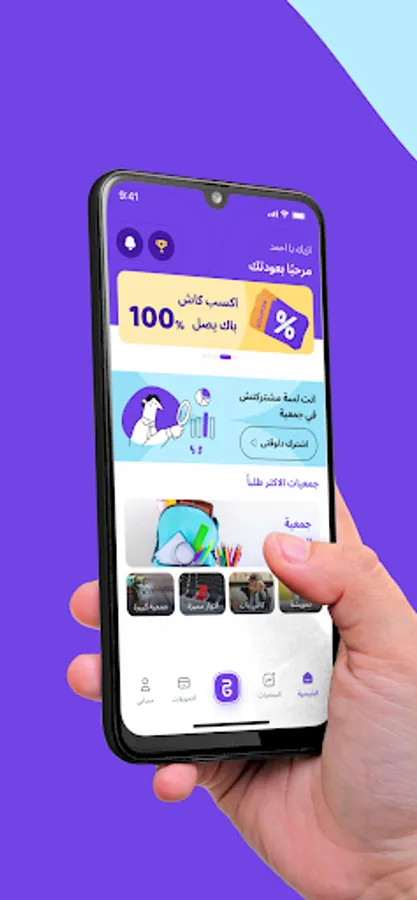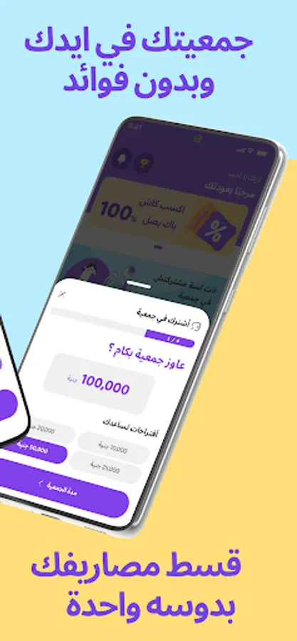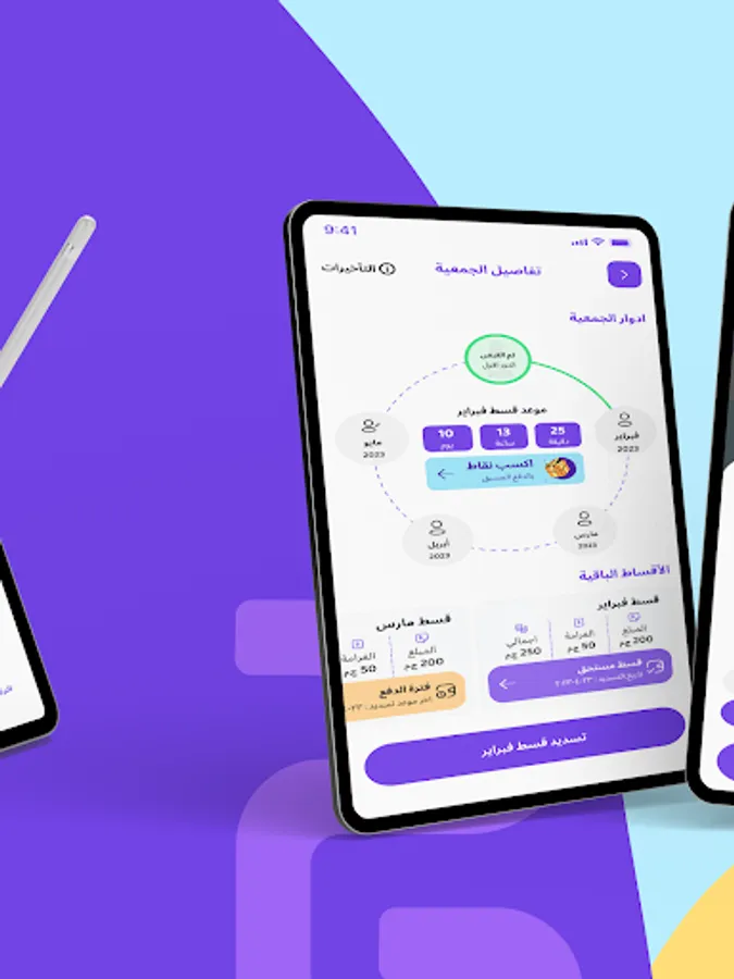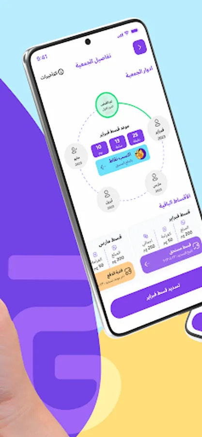 الابليكيشن بيضيفك تلقائياً لجمعية تناسب مواصفاتك، وبتقدر تدفع كل شهر عن طريق الابليكيشن، بأي طريقة دفع تناسبك، وتستلم فلوسك في الفترة اللي اخترتها، وكل ده بيخلّي الموضوع سريع ومريح.
