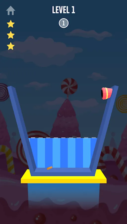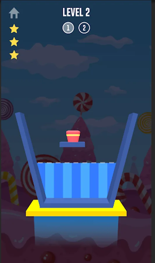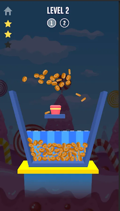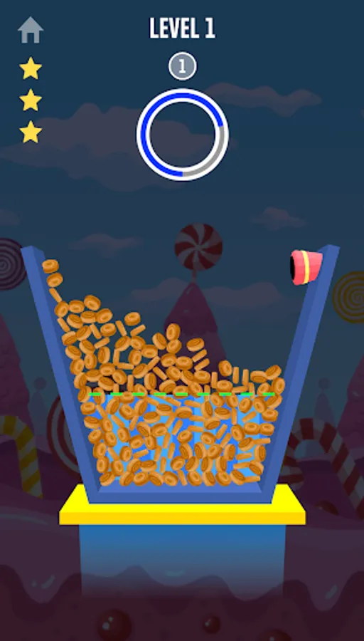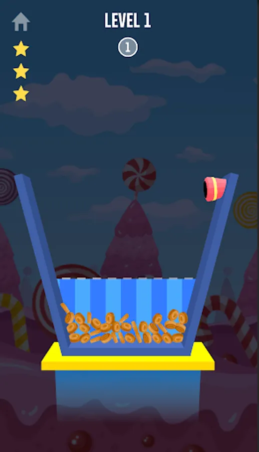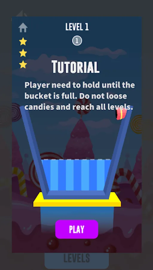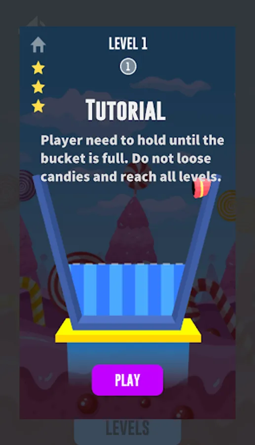 Player need to hold until the bucket is full. Do not loose candies and reach all levels.