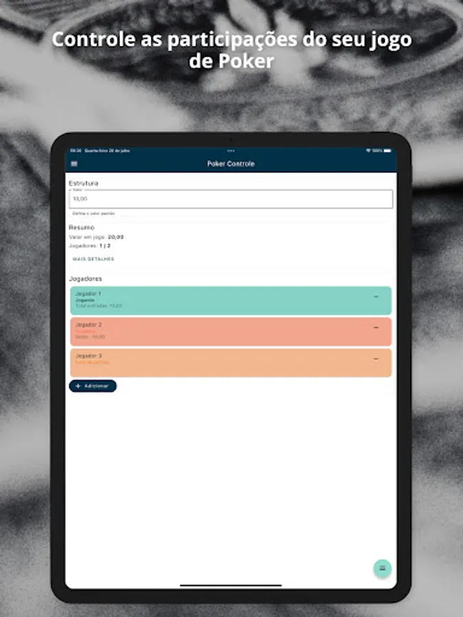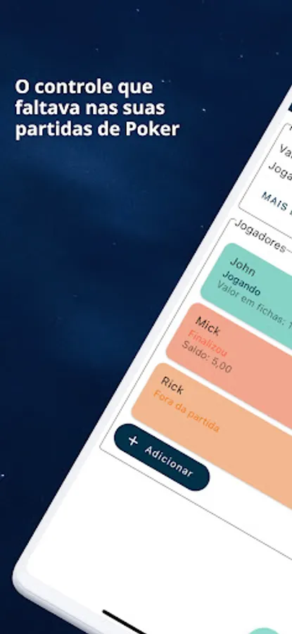 Increase the fun of your Poker games and avoid any money-related friction between players. Download Poker Controle right now and start enjoying the benefits of impeccable financial management in your Poker games. Get ready to have more time to play and less worries about money!