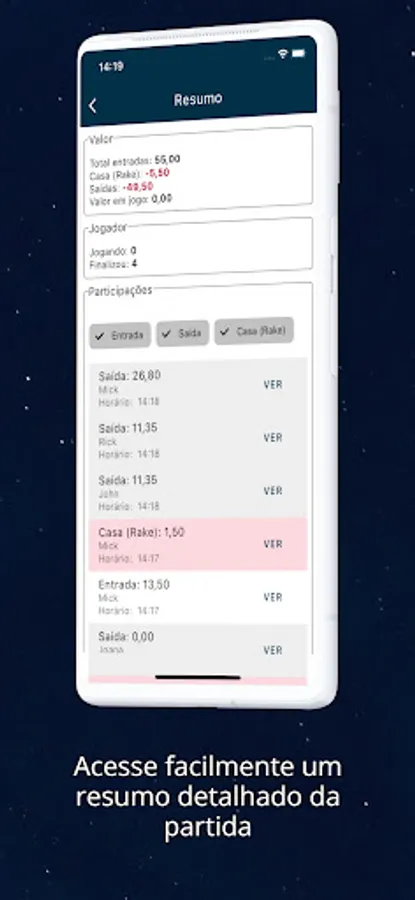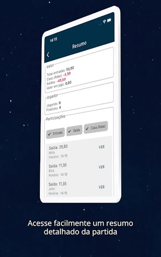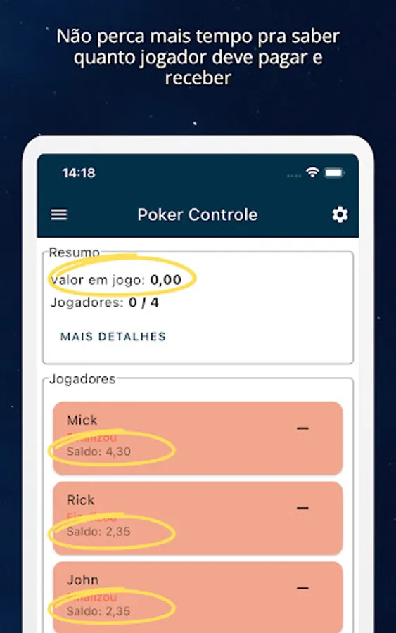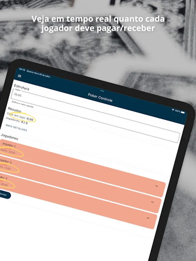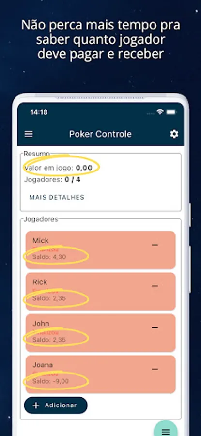 Say goodbye to messy spreadsheets and laborious calculations! Poker Controle is equipped with a powerful algorithm that automatically calculates the balances of each player. Find out instantly the amount that each player should receive or pay at the end of the game, ensuring a fair and transparent division.