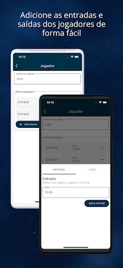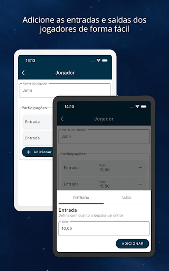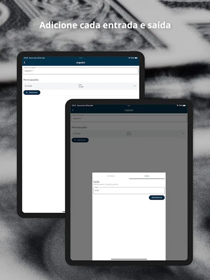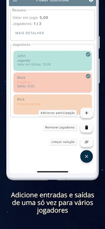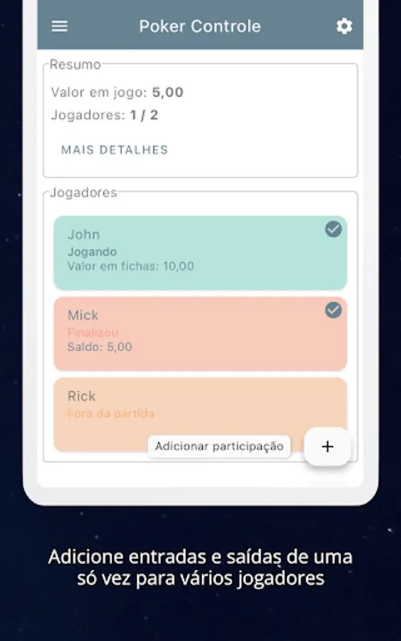 With Poker Controle, recording financial transactions during your Poker games is as easy as playing a Royal Flush. Enter the values of the entries and follow each monetary movement of the players in an intuitive and efficient way.