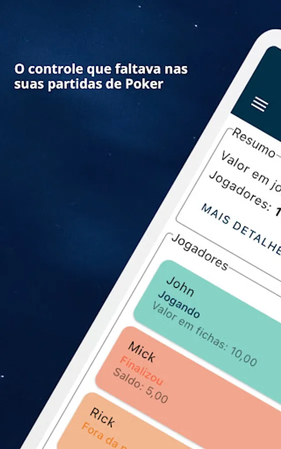 Do not you worry anymore! We present Poker Controle, the intelligent application that will make the financial control of your Poker matches a simple and uncomplicated task!
