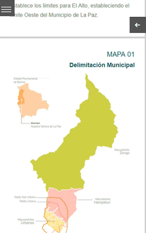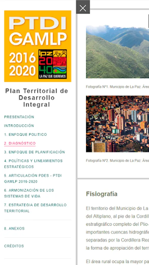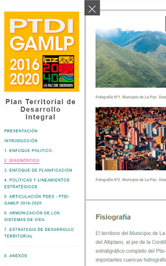 Based on these premises, the Diagnostic chapter identifies the future problems and challenges of the municipality, in terms of Territorial Occupation, Integral Human Development, Plural Economy and Institutional Development to give rise to the Planning Approach, based on the Management of Life Systems and Risk Management and Climate Change, describing the diversity of the La Paz municipality, in terms of geography, climate, vegetation, biodiversity, among others, added to the population and its organization in the territory.