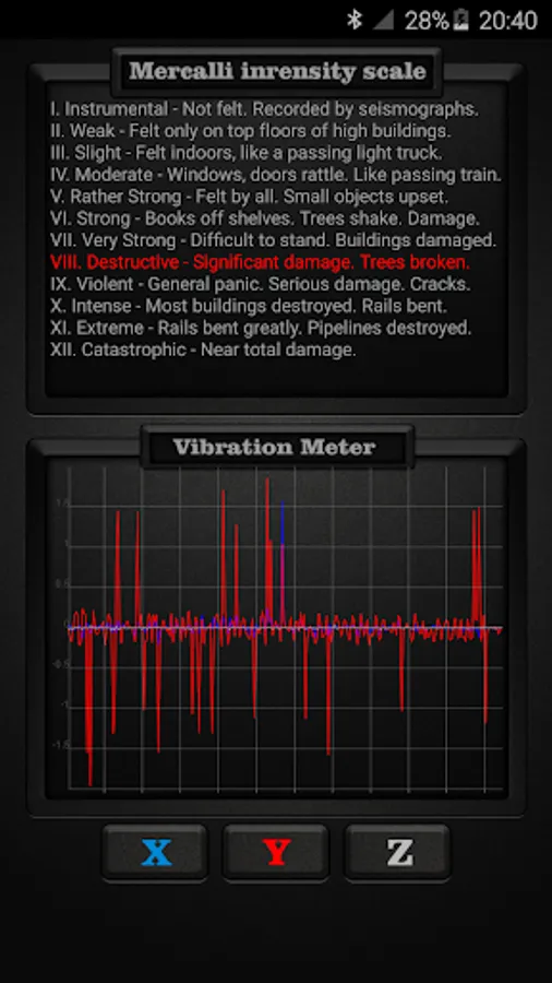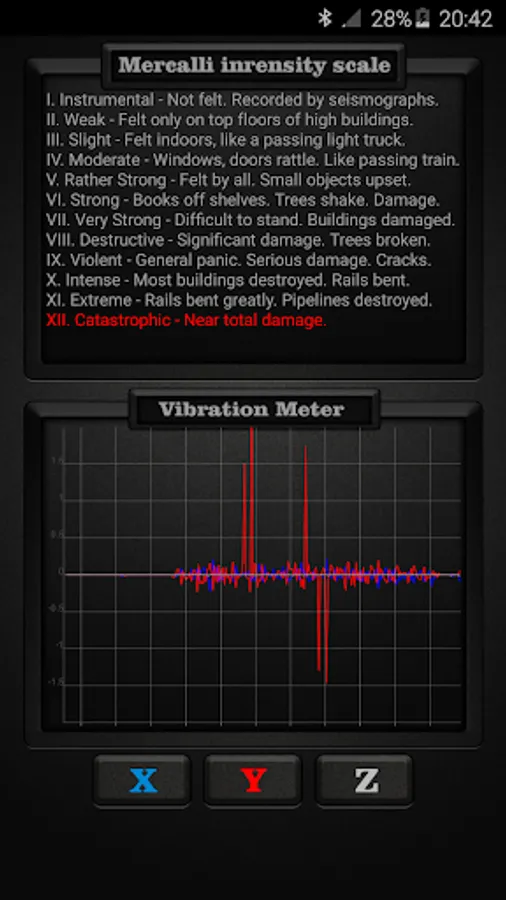Vibration Meter measures vibrations using your device’s sensors on all 3 axes: X, Y, Z and shows reference to earthquake vibrations as classified by internationally used Mercalli intensity scale for seismic activities such as earthquakes. The Mercalli intensity scale is a seismic scale used for measuring the intensity of an earthquake. It measures the effects of an earthquake. Vibration Meter can also be called seismograph or seismometer when used for measuring seismic activity.