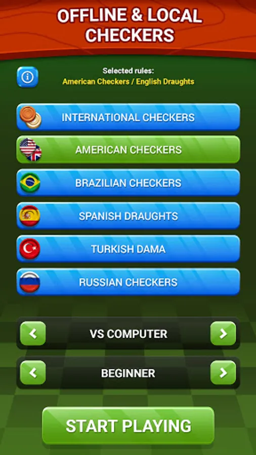 You can also play offline checkers against the computer or friends. The offline game offers 5 different levels of difficulty meant to enable you to improve your skills!