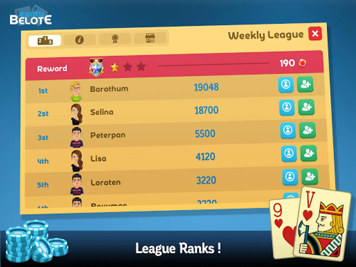 From now on, each of your belote games is part of a League! The goal now is to win as many games as possible to become one of the best multiplayer belote players in France! There are 5 leagues with 3 levels each. At the end of the league get rubies to buy privileges and more bonus with VIP belote status.