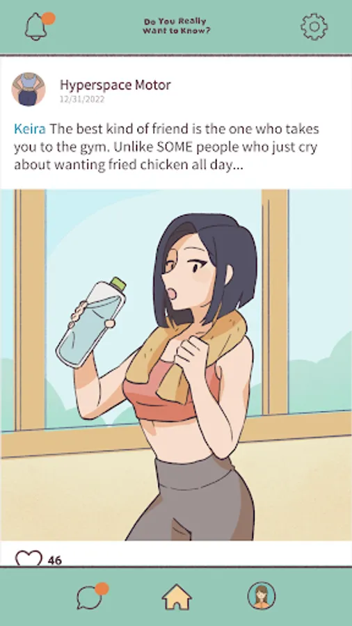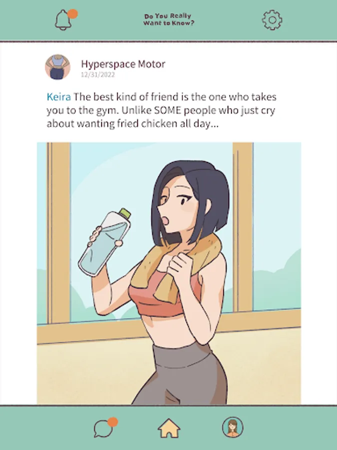 Do You Really Want to Know? is a role-playing game that simulates a social media app. Overprotective parents, dysfunctional workplaces, and friends with hidden agendas - all the pressures and events could be opportunities to reexamine each other's relationships. Post updates, send messages, and make choices. Can you maintain the relationships you want if you reveal your true self?