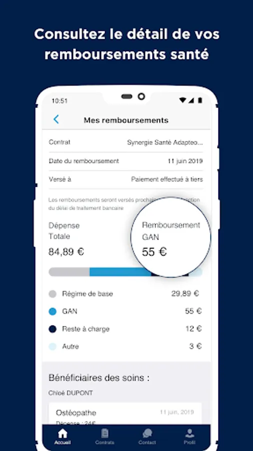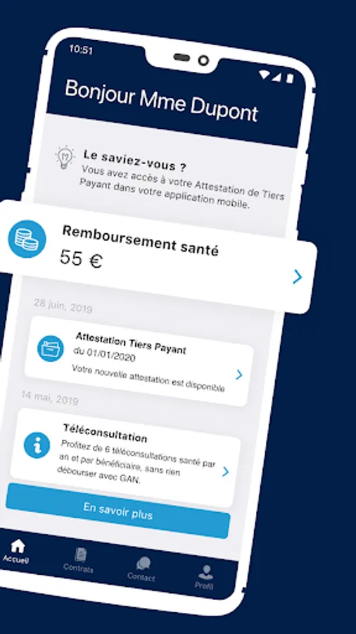 As soon as you log on to Gan Santé, view the latest events related to your contract on your homepage: health reimbursement for less than 90 days, information from your insurer, and also have easy access to all the services available on the application. .